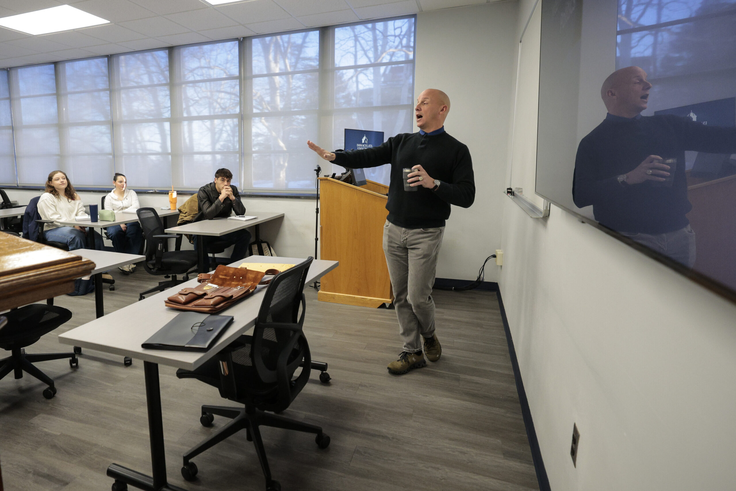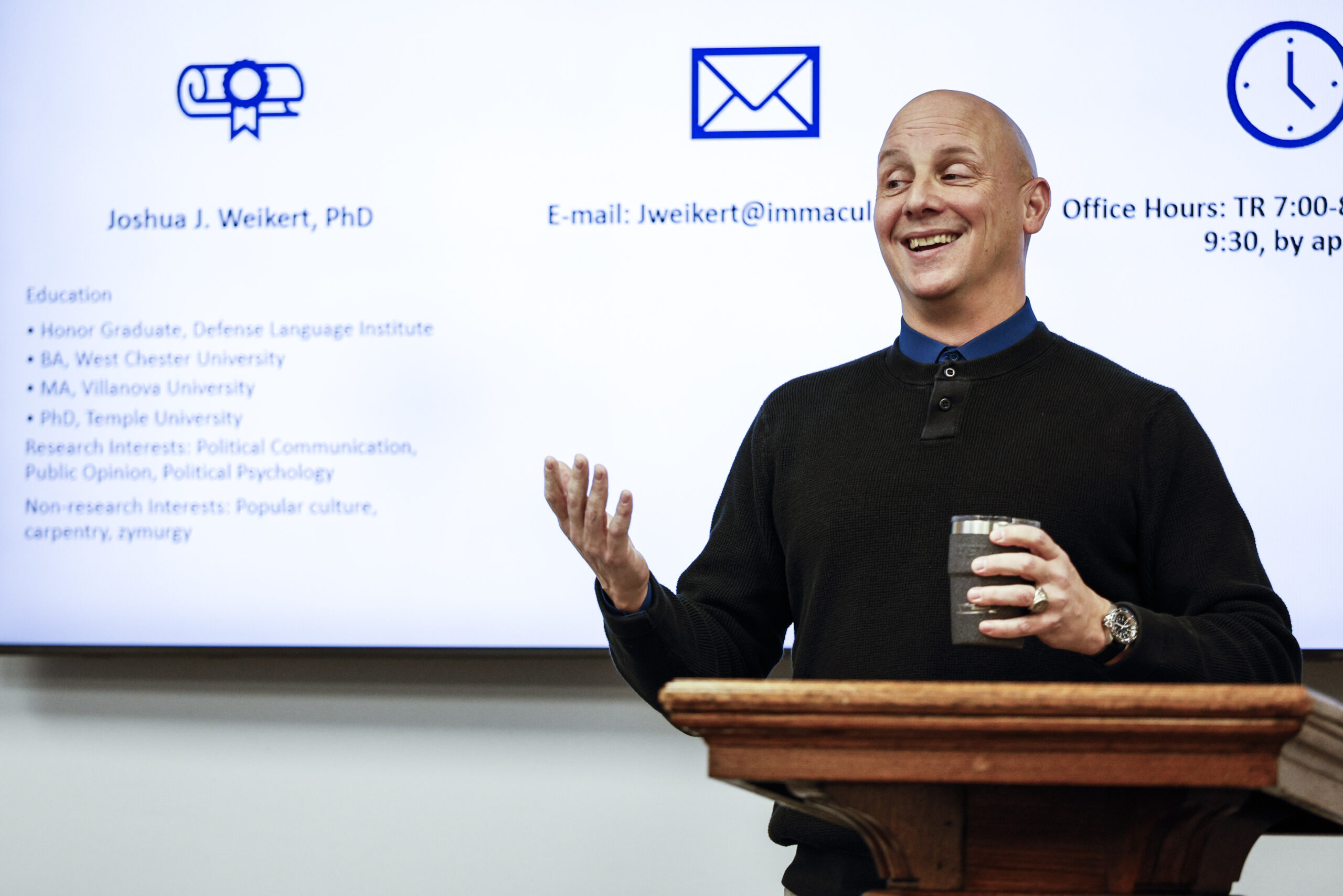 Joshua Weikert teaches a class in international relations at Immaculata University.