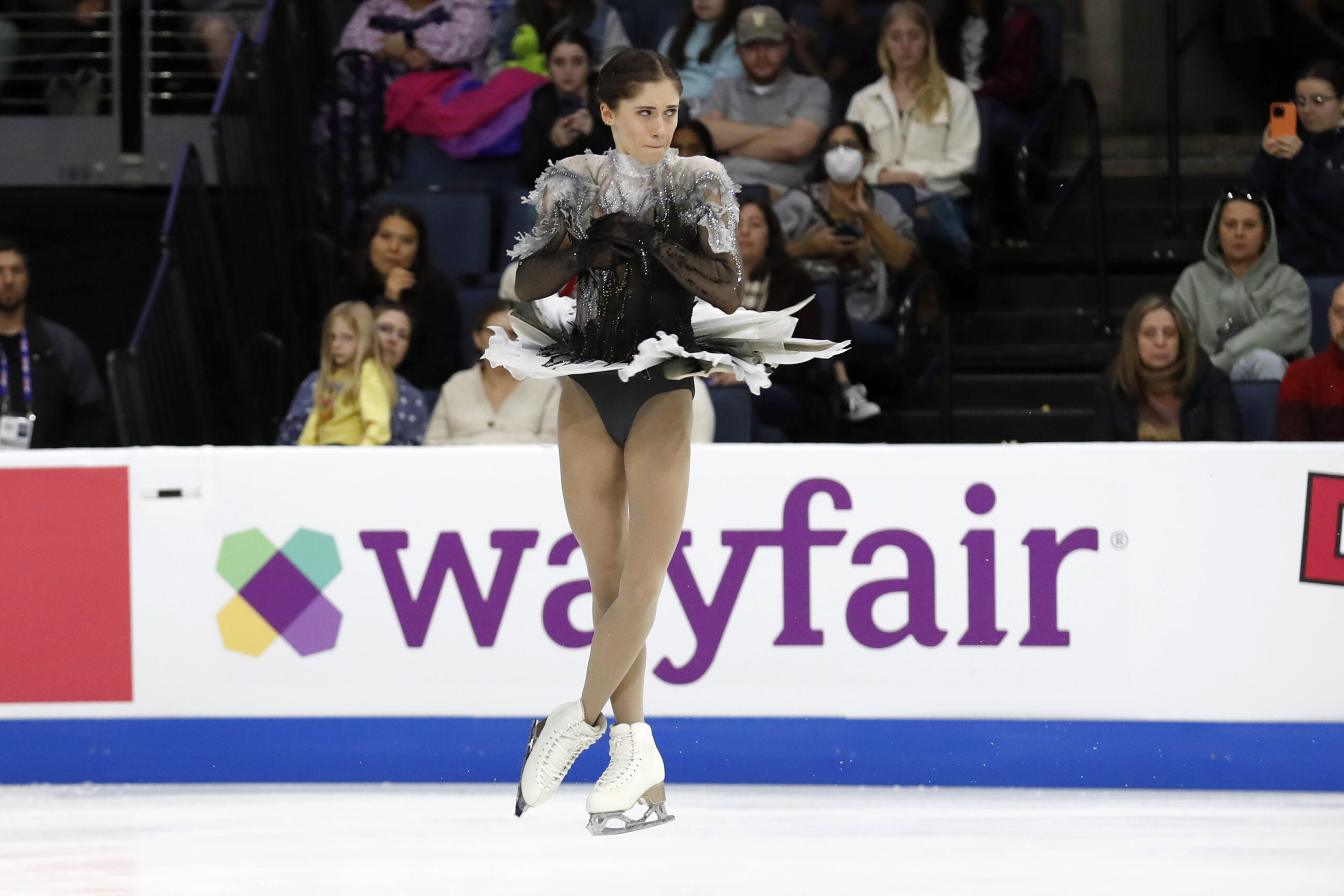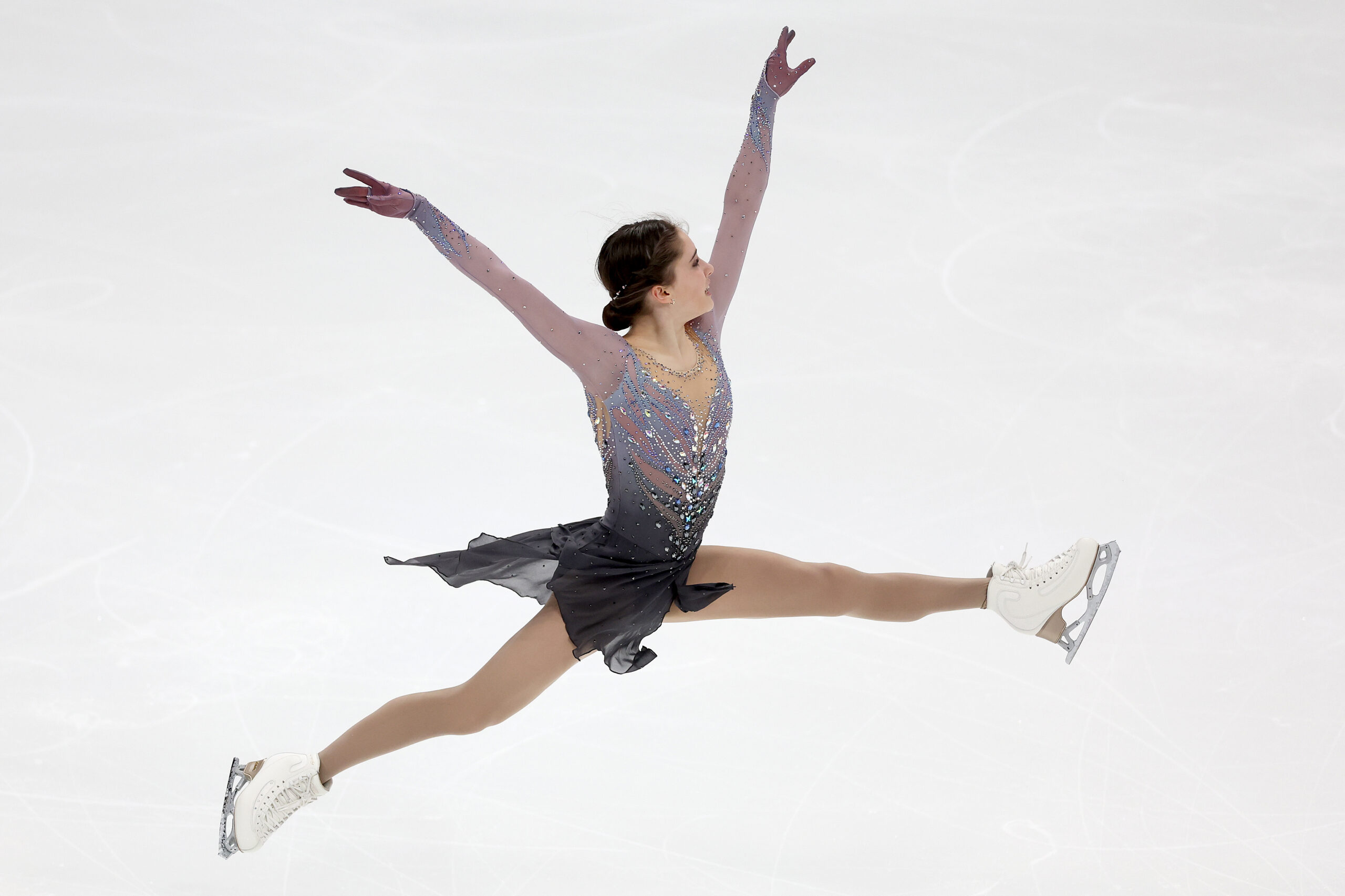 Levito wore this layered black, white, and gray dress the first part of the 2023-24 season for her long program, skating to “The White Crow,” by Lisa Batiashvili. After placing third in the short program at Skate America that season, she finished second in the free skate to end in second overall.