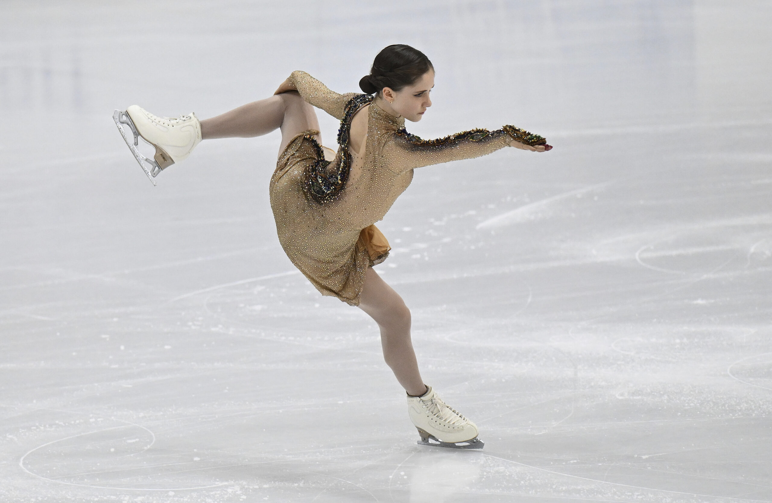 Isabeau Levito was too young for the Olympics in 2022, but she won the bronze medal at the U.S. Figure Skating Championships in this dress, made in Russia. She was also named to the World Junior Championships, where she skated to the “Russian Dance” from Swan Lake by Tchaikovsky, and won.