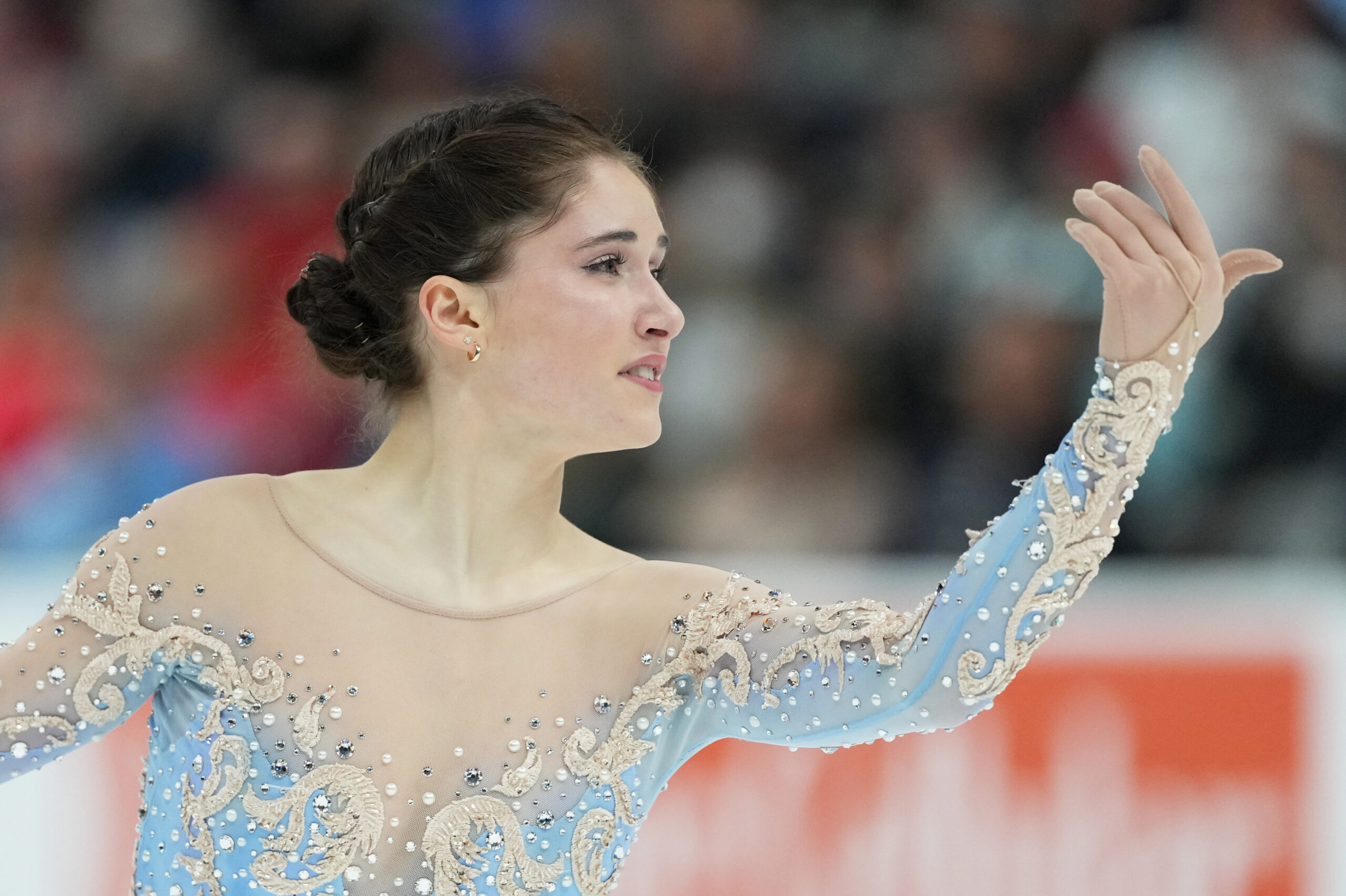 Levito is wearing this blue dress by McKinnon for her free skate (or long program) this season, and skates to “Cinema Paradiso” by Ennio Morricone. She won bronze at January’s U.S. Figure Skating Championships to earn the trip to Milan.