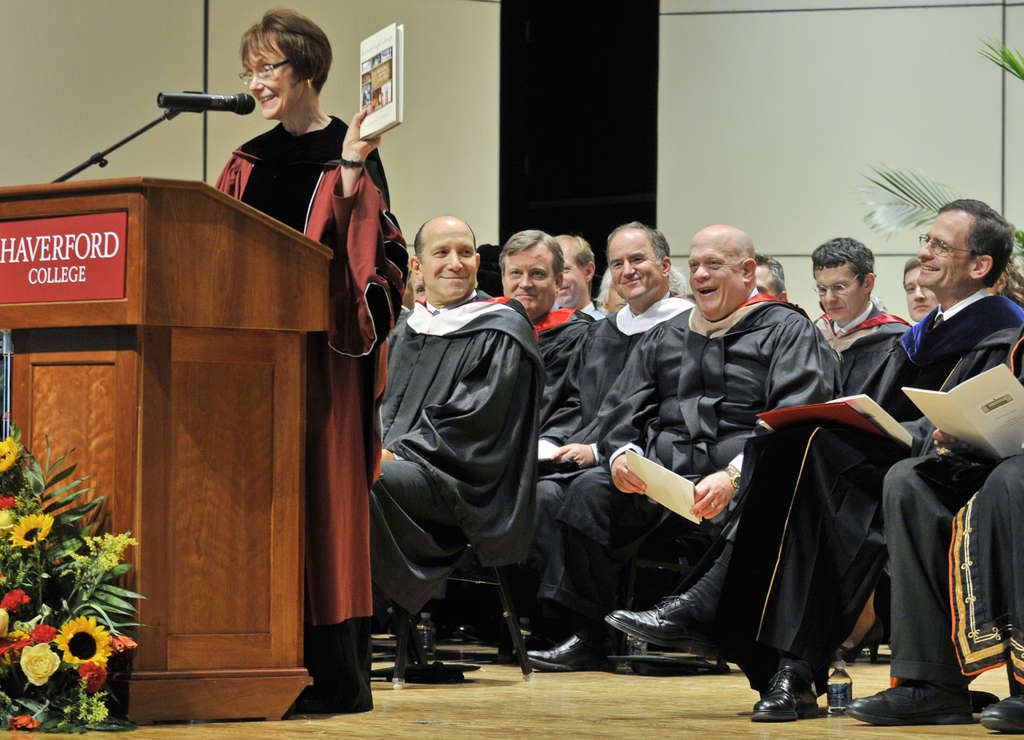 A 2013 photo of then-Swarthmore College president Rebecca Chopp showing off a copy of “Remaking College” at the inauguration of president Daniel H. Weiss at Haverford College, who is now director and CEO of the Philadelphia Art Museum.