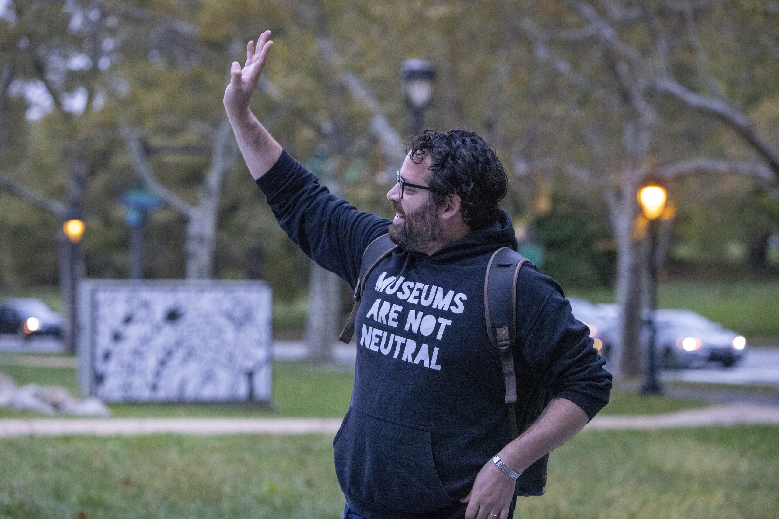 Adam Rizzo, former president of the Art Museum union, an affiliate of AFSCME DC47, waving to a honking supporter on the morning museum employees returned to work after a strike in 2022.