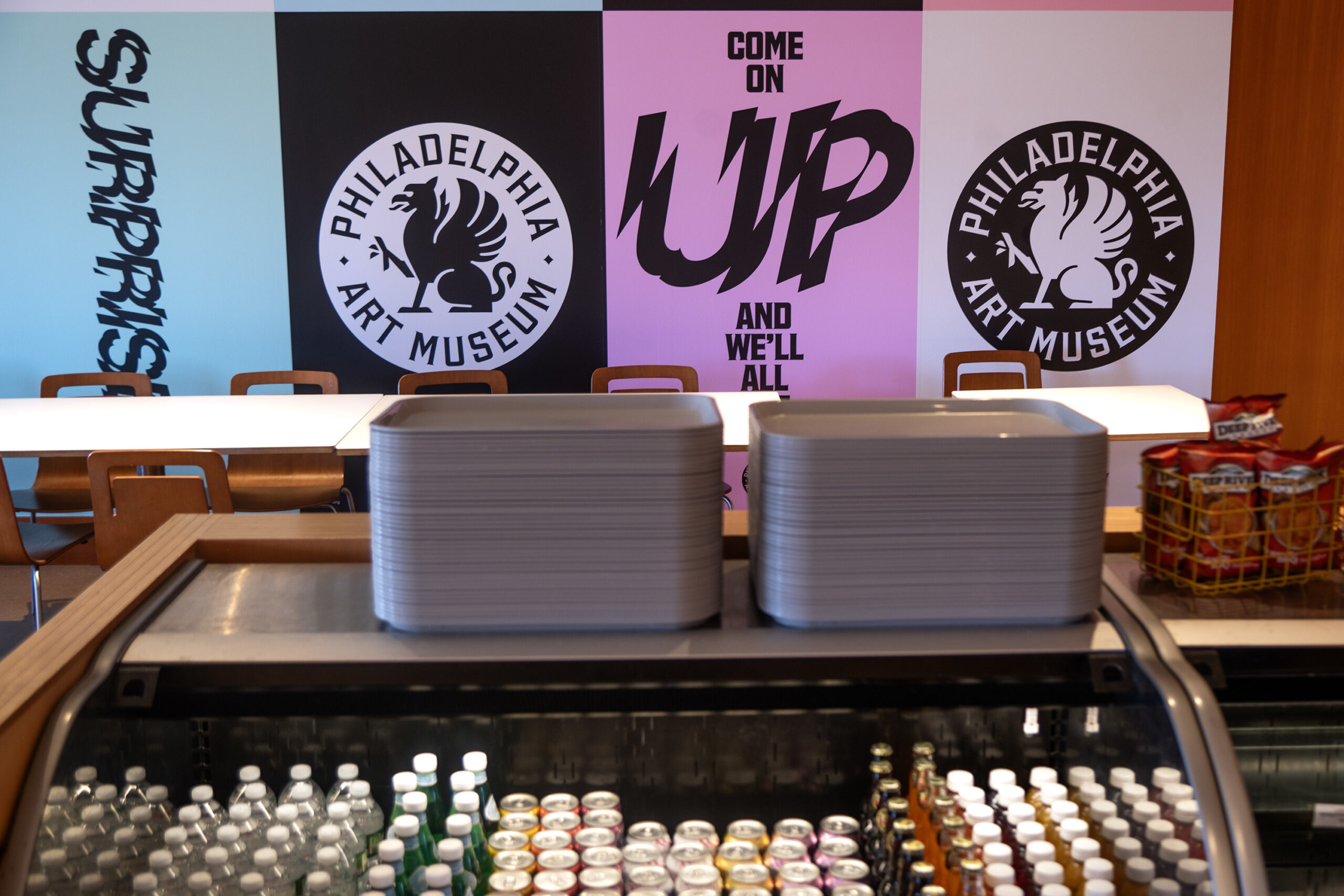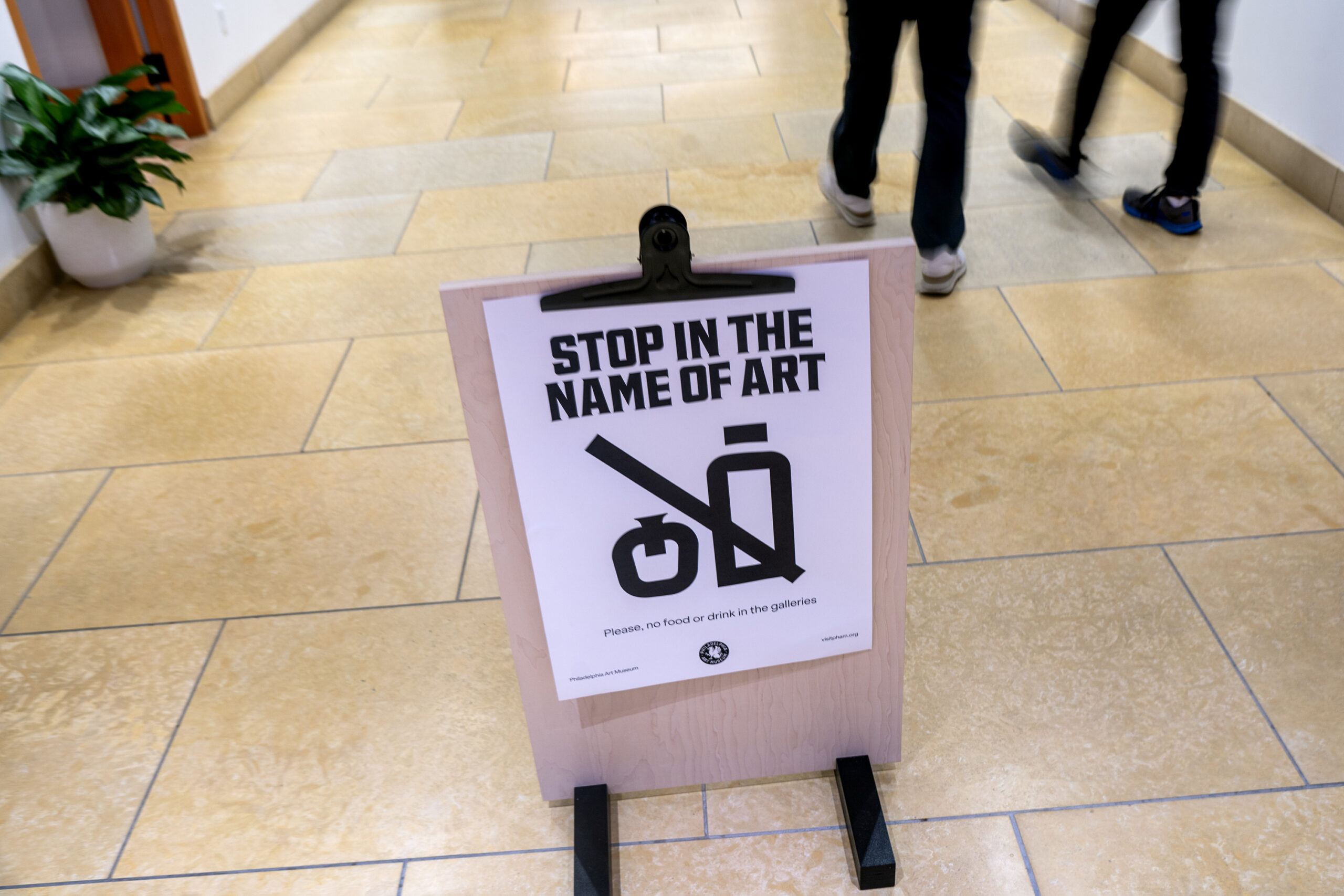 “Please no food or drink in the galleries” sign outside the cafe at the Philadelphia Art Museum, Oct. 6, 2025, showing the museum’s rebrand graphics.