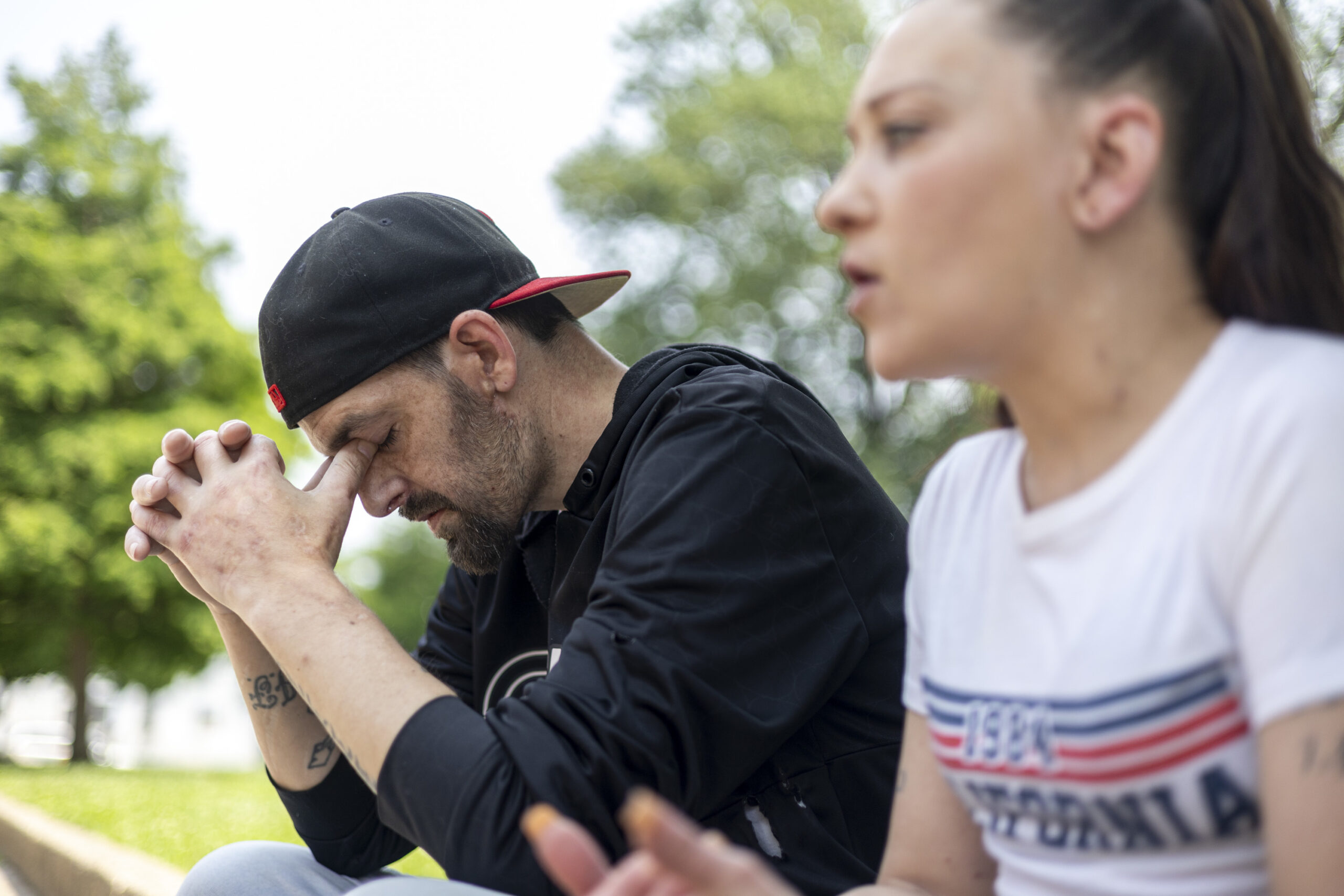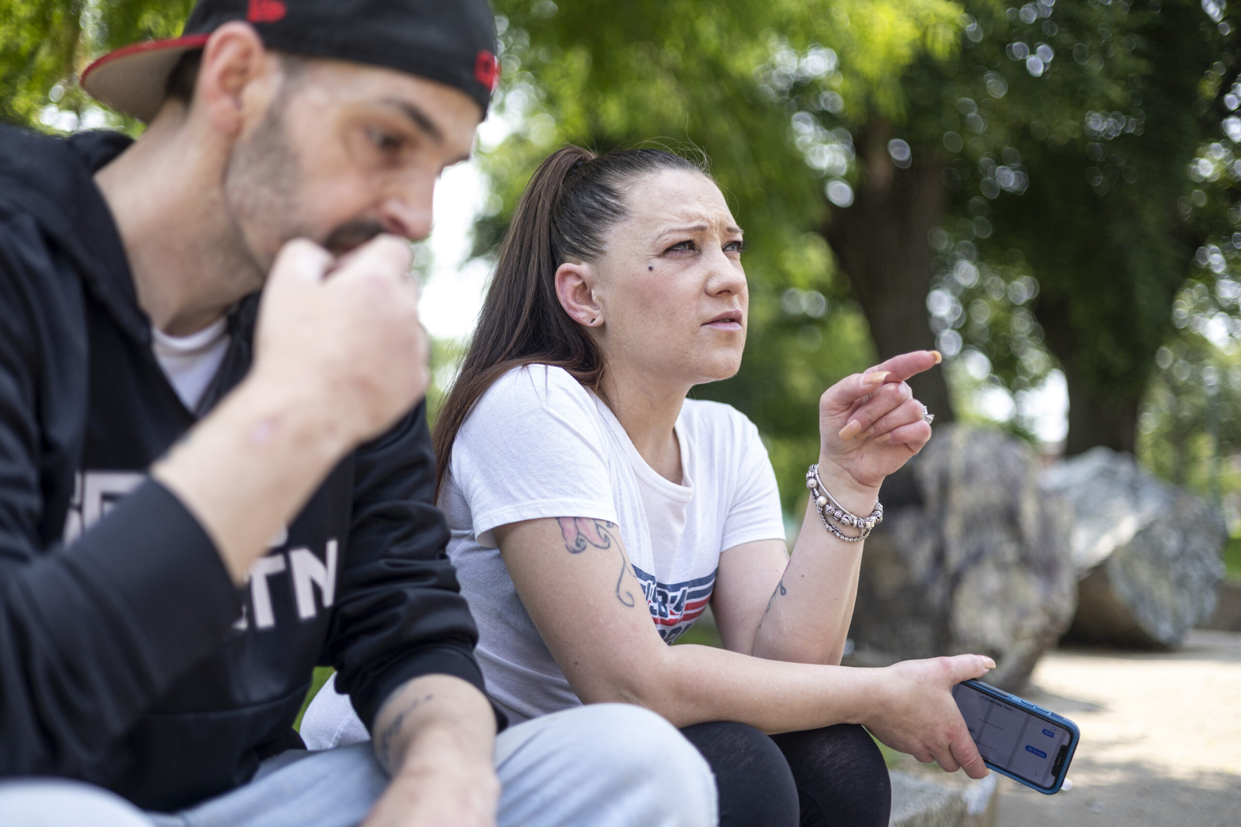 Christina Gallo and Daniel Zehnder in June, sitting in the spot where they were first approached by The Rehab Specialist recruiters in McPherson Square Park.
