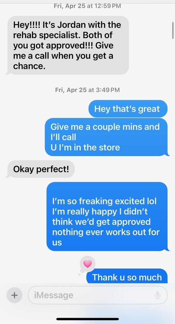 Screenshot of text messages between Christina Gallo and a Rehab Specialist recruiter, saying that Gallo and Zehnder got approved for private insurance that would pay for their treatment in California.