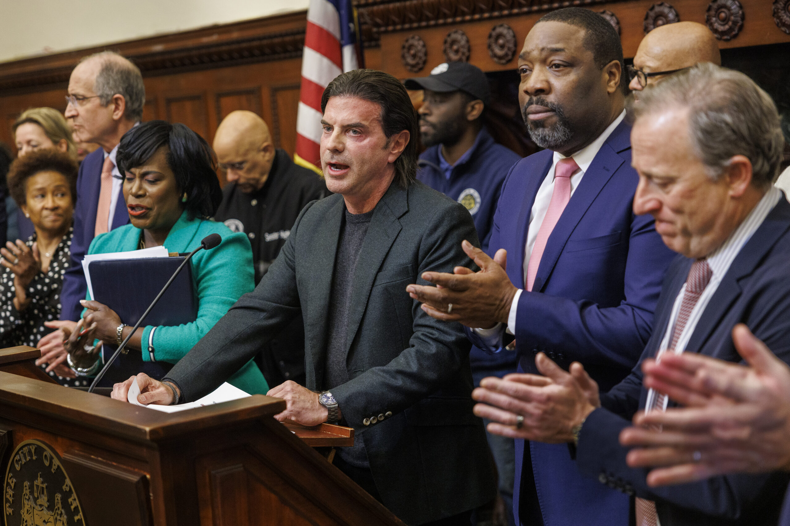 David Adelman with the Philadelphia 76ers makes a statement at a press conference in the Mayor’s Reception Room in January regarding the Sixers changing directions on the controversial Center City arena. At left is mayor Parker, at right City Council President Kenyatta Johnson and Josh Harris, Sixers owner.