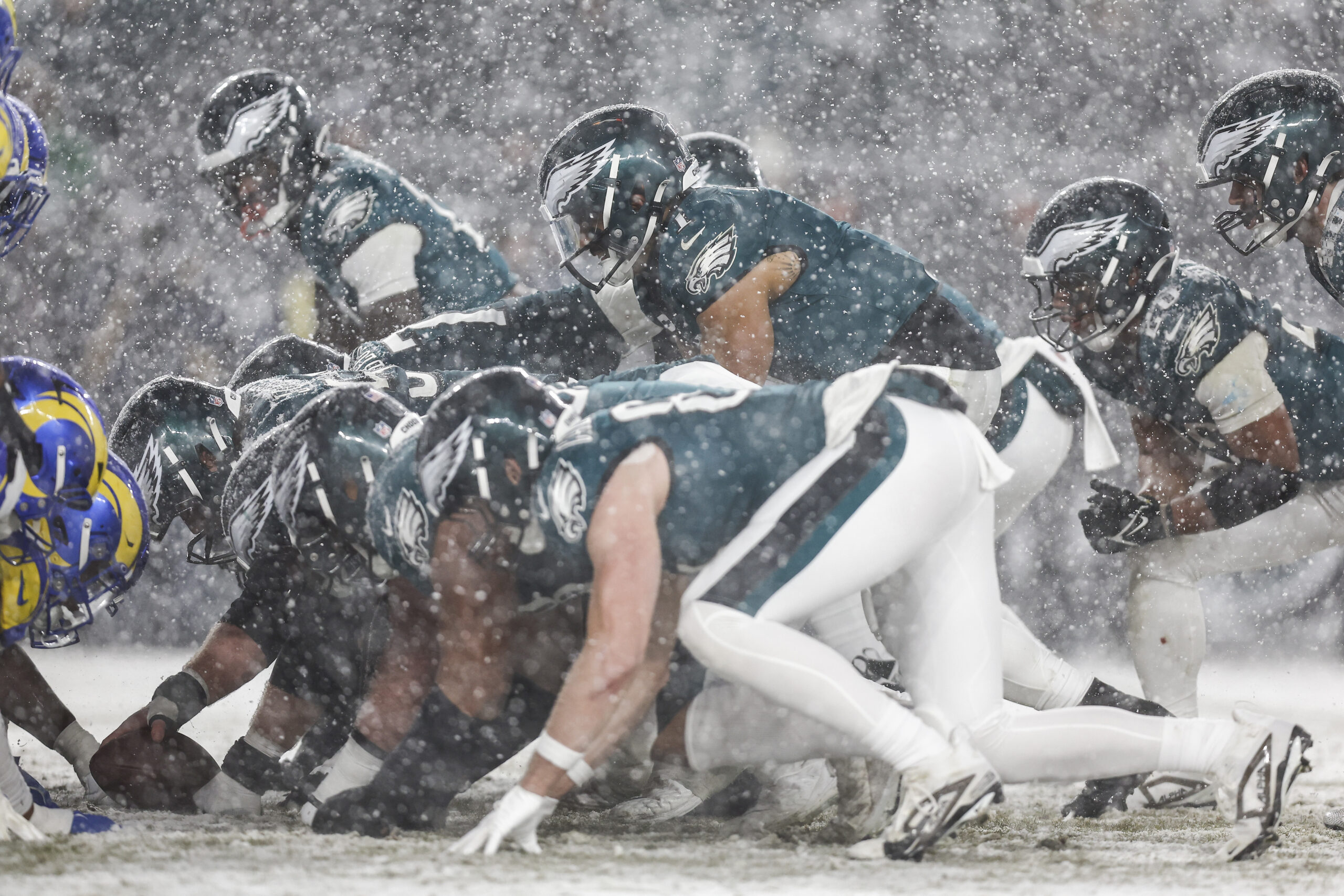 Philadelphia Eagles quarterback Jalen Hurts at the line of scrimmage during the fourth quarter of the NFC divisional playoff at Lincoln Financial Field on Jan. 19. The Philadelphia Eagles defeated the Los Angeles Rams 28 to 22.