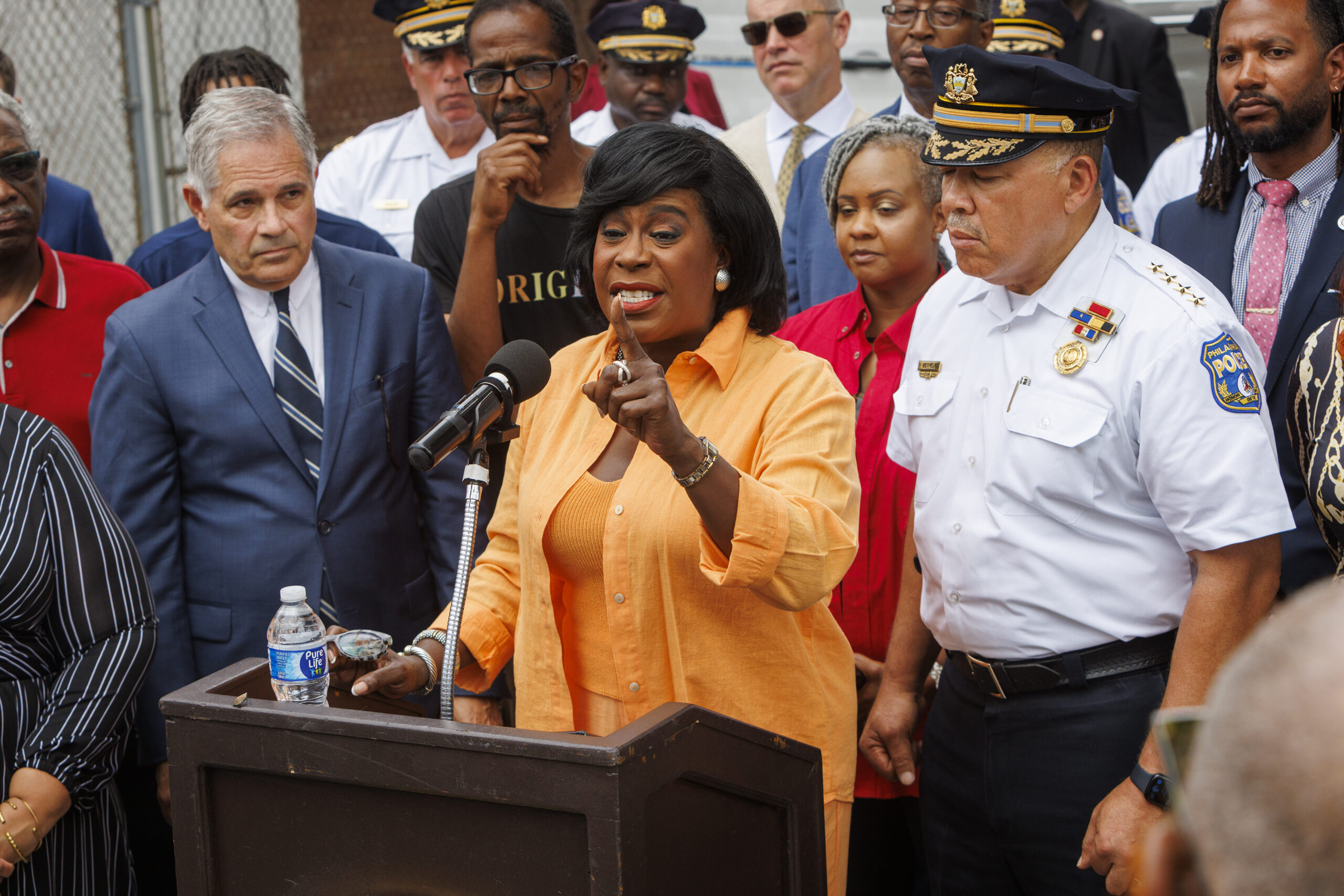 In this 2024 file photo, Philadelphia Mayor Cherelle L. Parker is flanked by Police Commissioner Kevin Bethel and District Attorney Larry Krasner during a news conference.