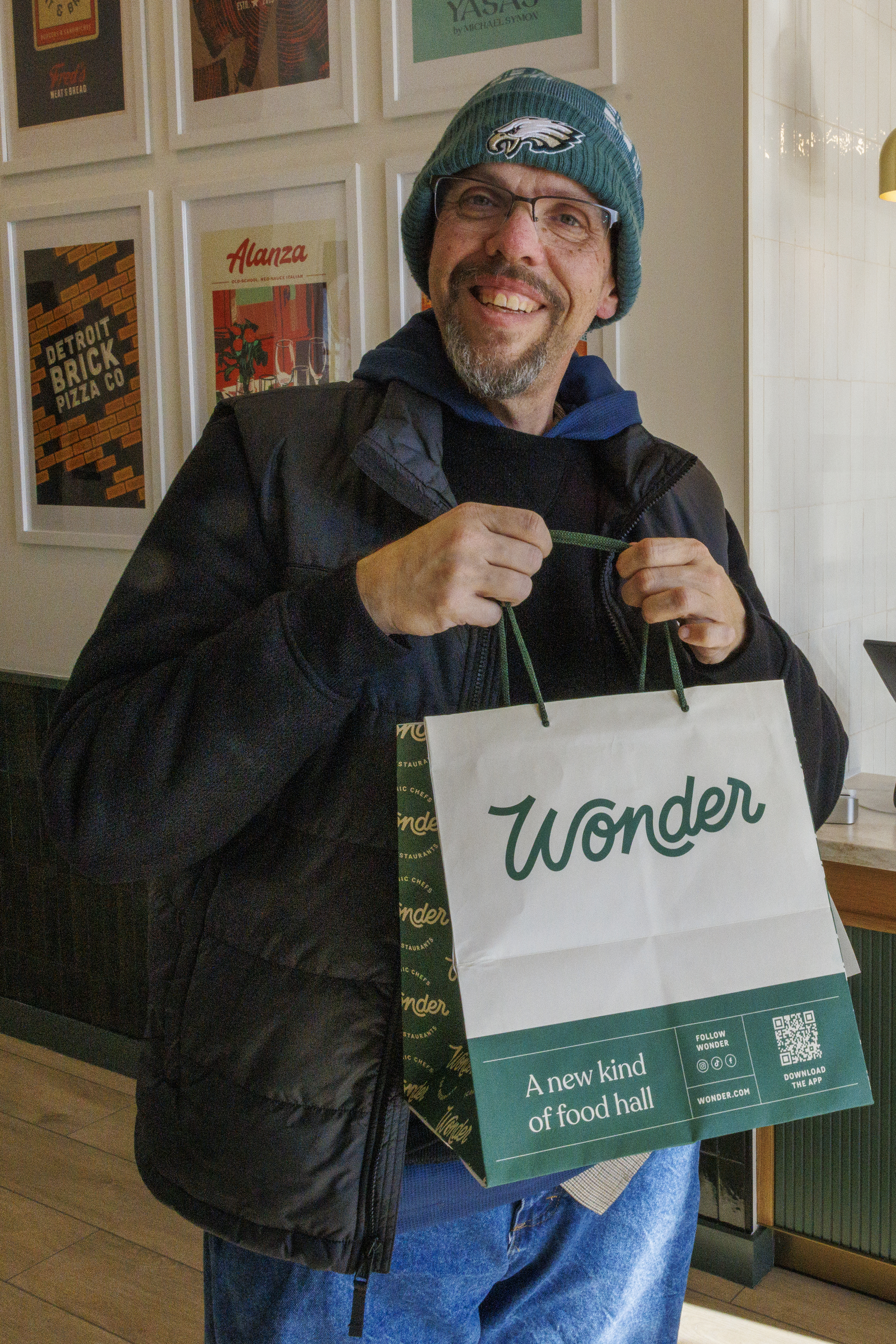 Steve Skalis, of Springfield, picks up an oder of drunken noodles during Wonder’s soft opening in Media on Tuesday, December 16, 2025.