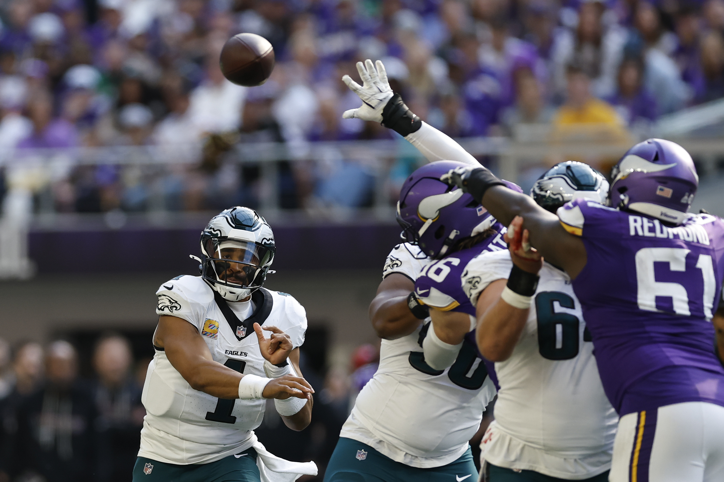 Eagles quarterback Jalen Hurts threw three touchdowns in Sunday’s win over the Vikings.