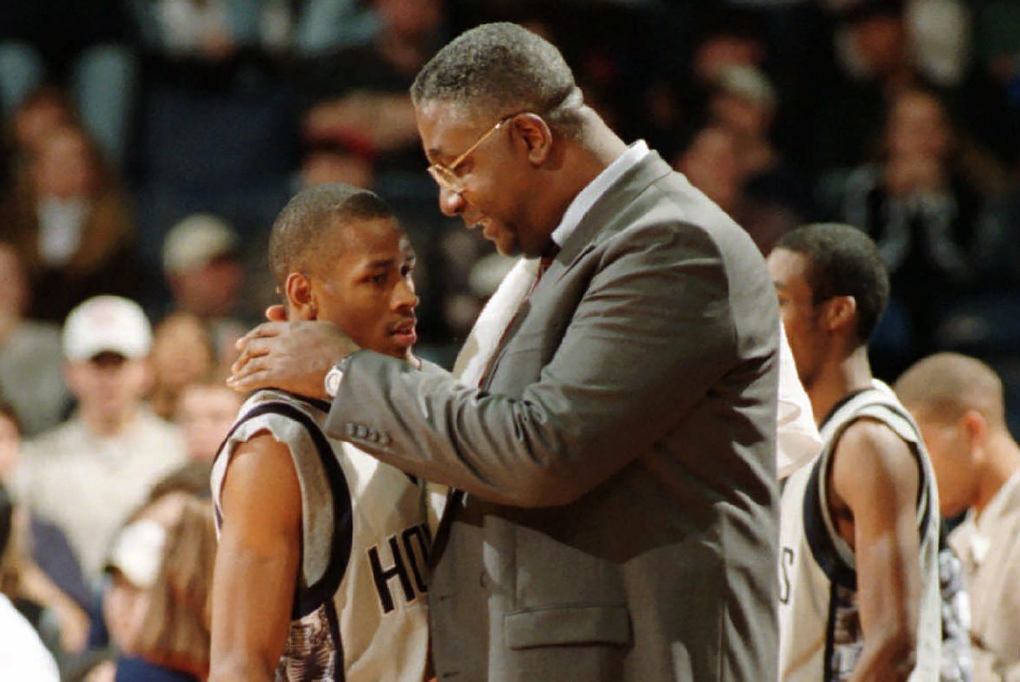 Georgetown’s head coach John Thompson talks to Allen Iverson during a game against St. John’s on Jan. 24, 1996.