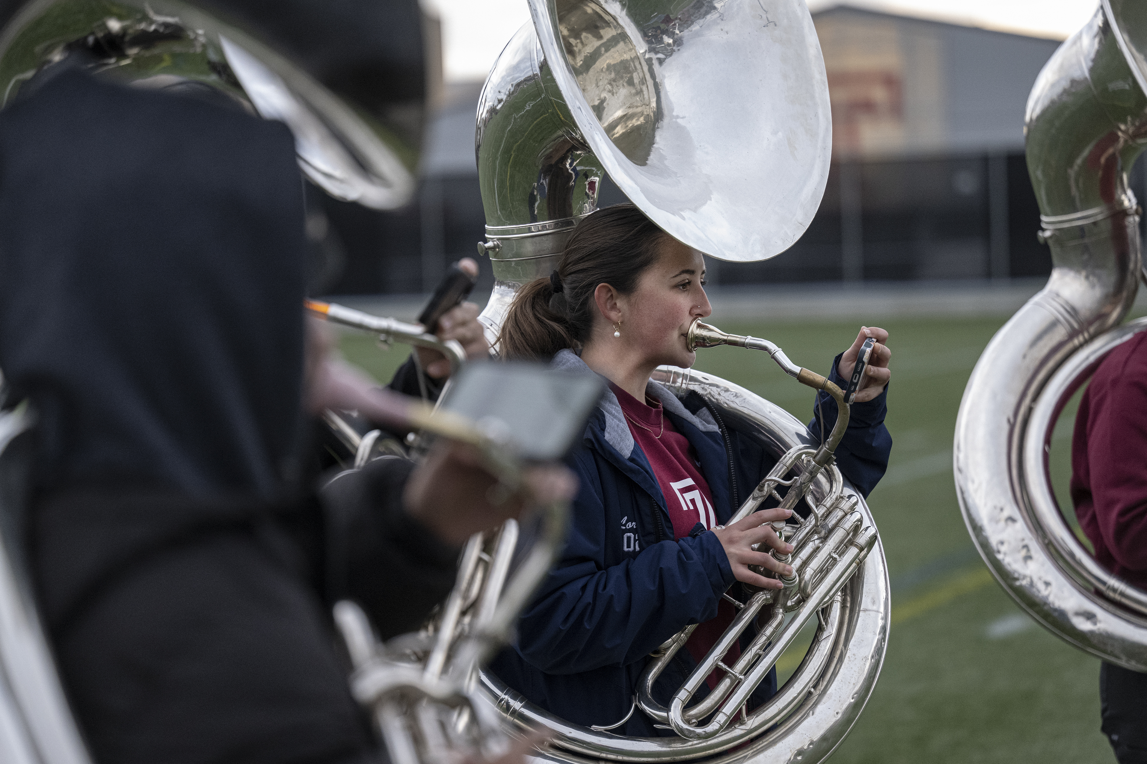 Temple University tuba player Lorali Minde plays the tuba in the marching band.