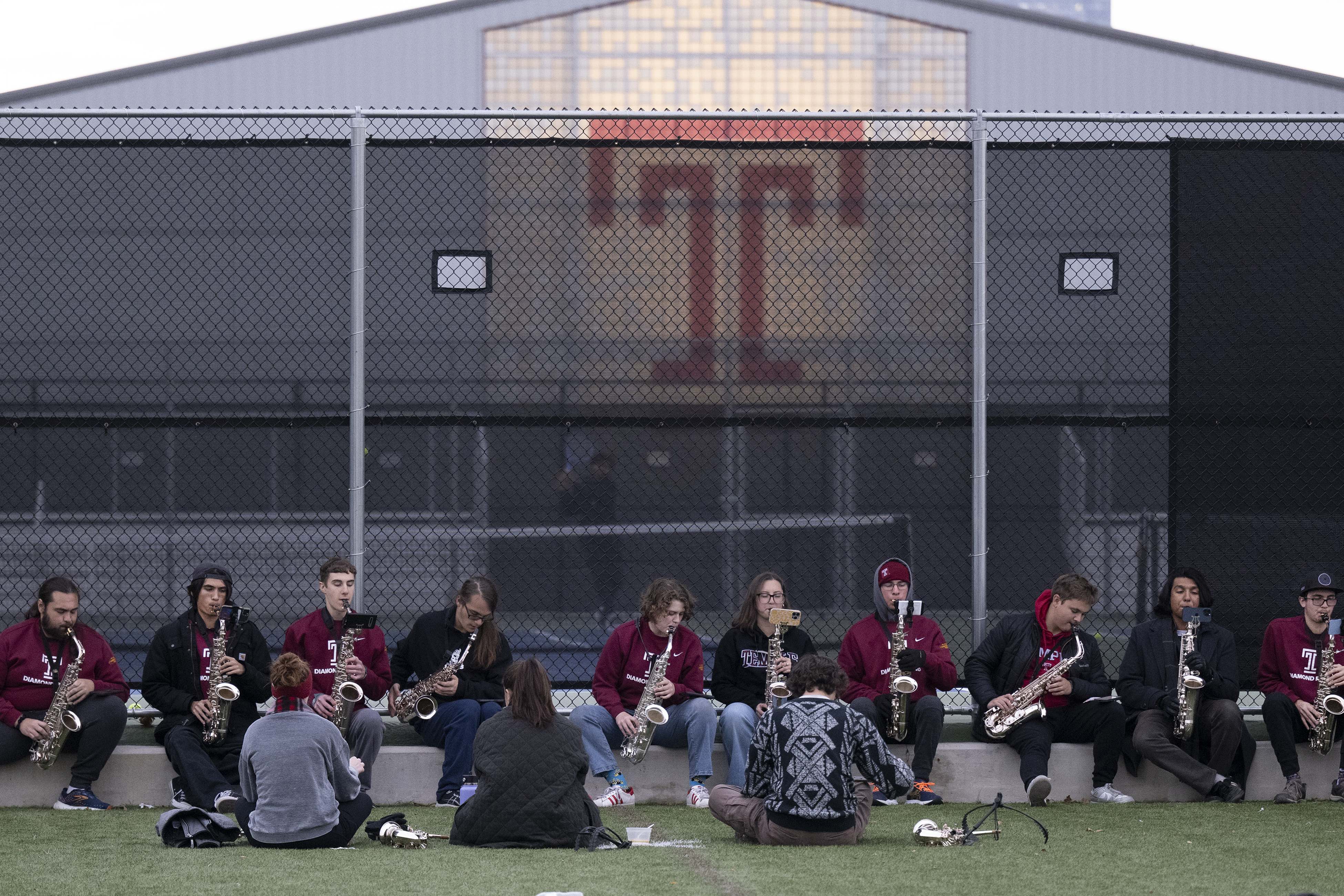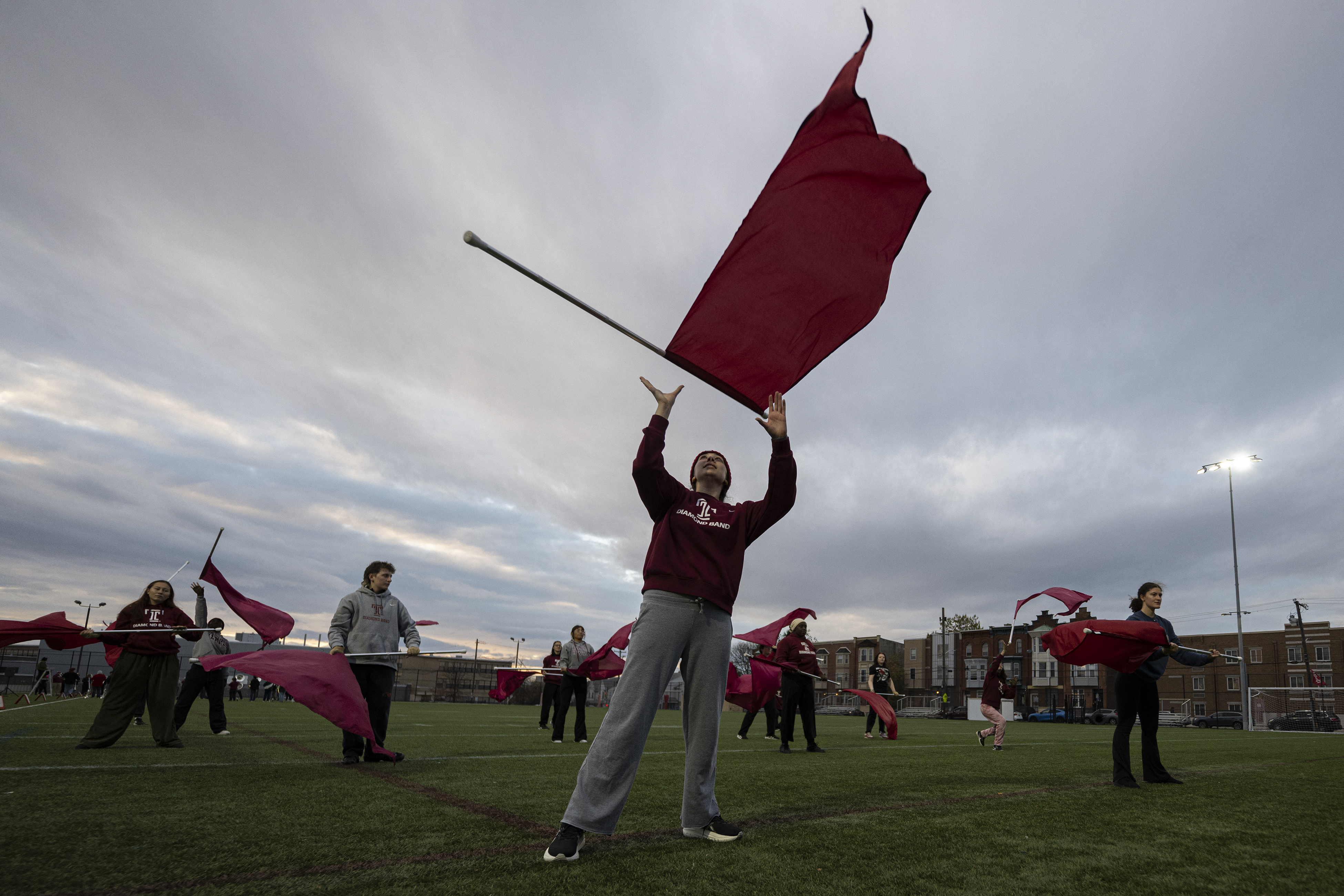 As the pink of twilight peeked through the November clouds, Temple University’s Diamond Marching Band, instruments and flags in tote, practiced on the campus’ Geasey Field.