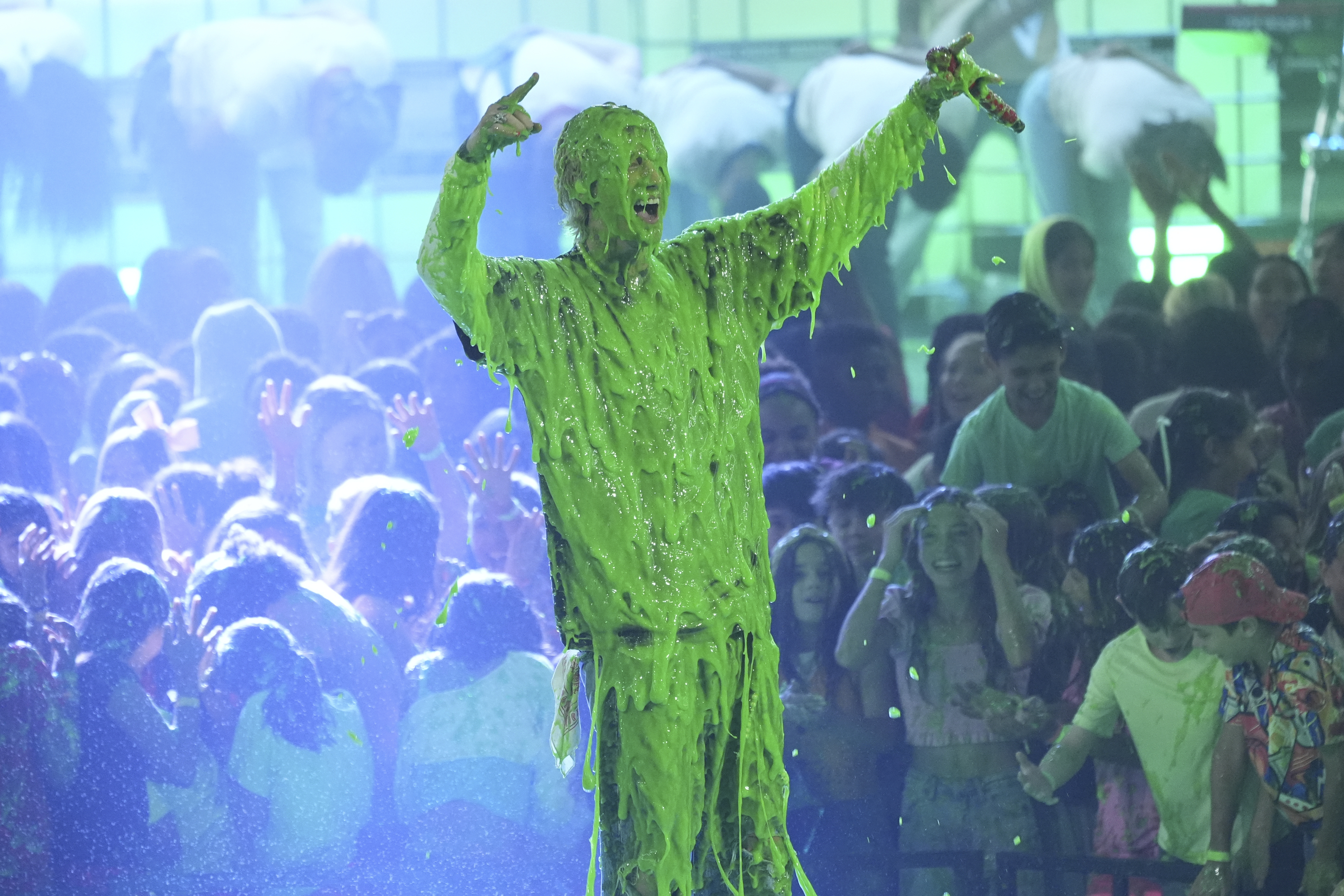 Machine Gun Kelly gets slimed after performing “Cliche” during the Nickelodeon Kids’ Choice Awards on Saturday, June 21, 2025, at The Barker Hangar in Santa Monica, Calif. The artist, now known as mgk, plays Xfinity Mobile Arena on Sunday. (AP Photo/Chris Pizzello)