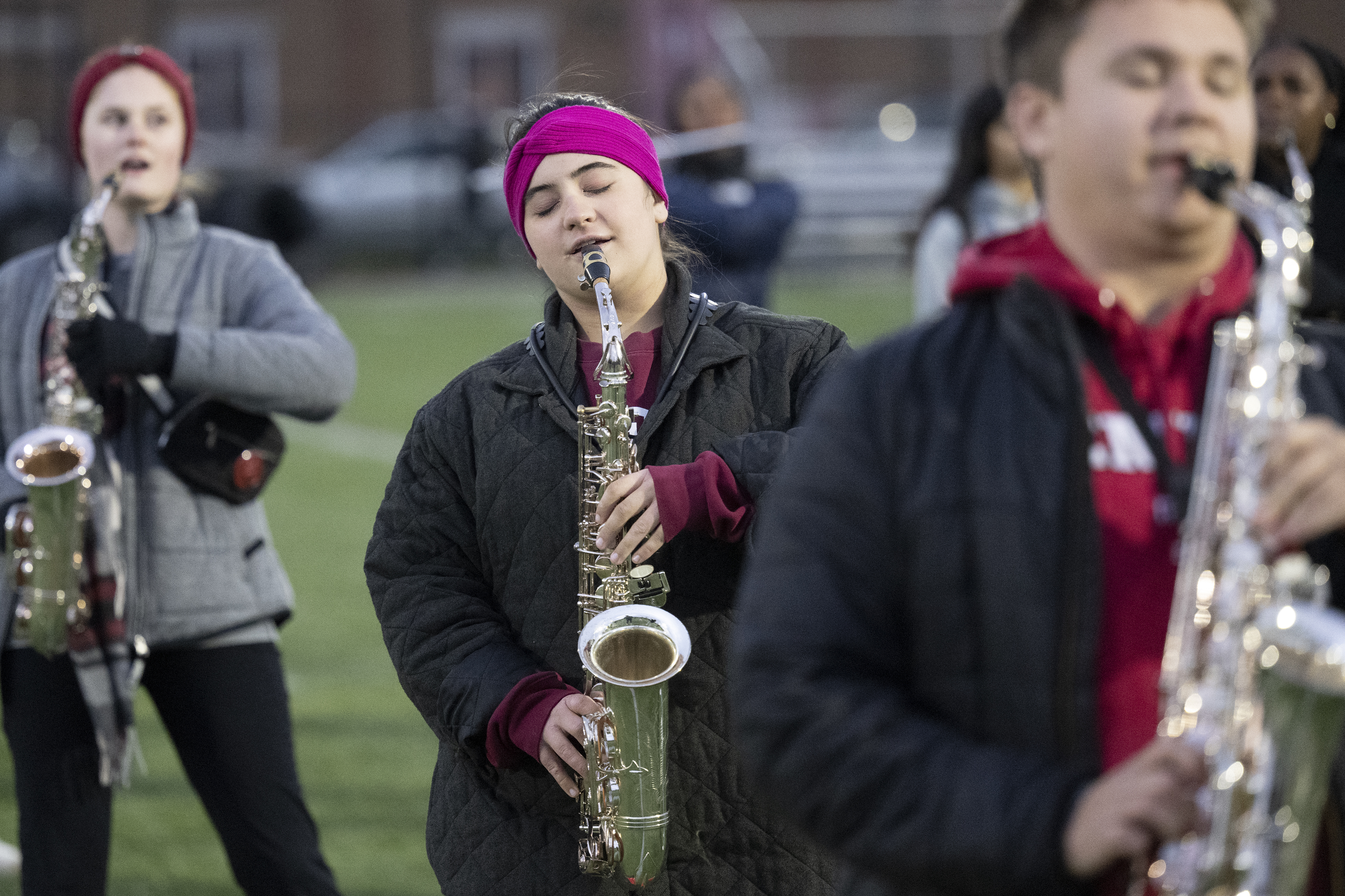 Temple University alto saxophone player Erin Flanagan rehearses with the marching band.
