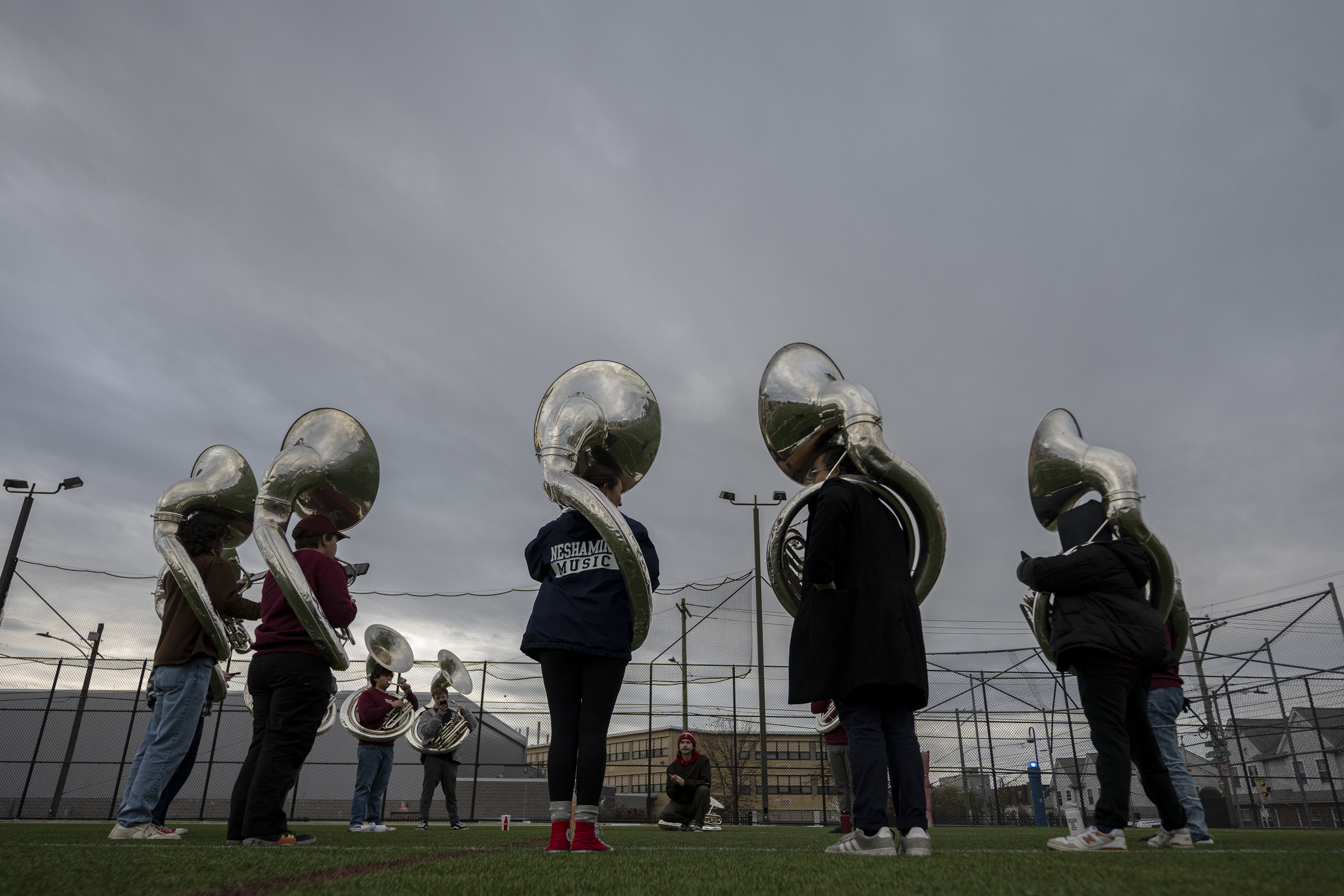Temple University Marching Band tuba players practice.