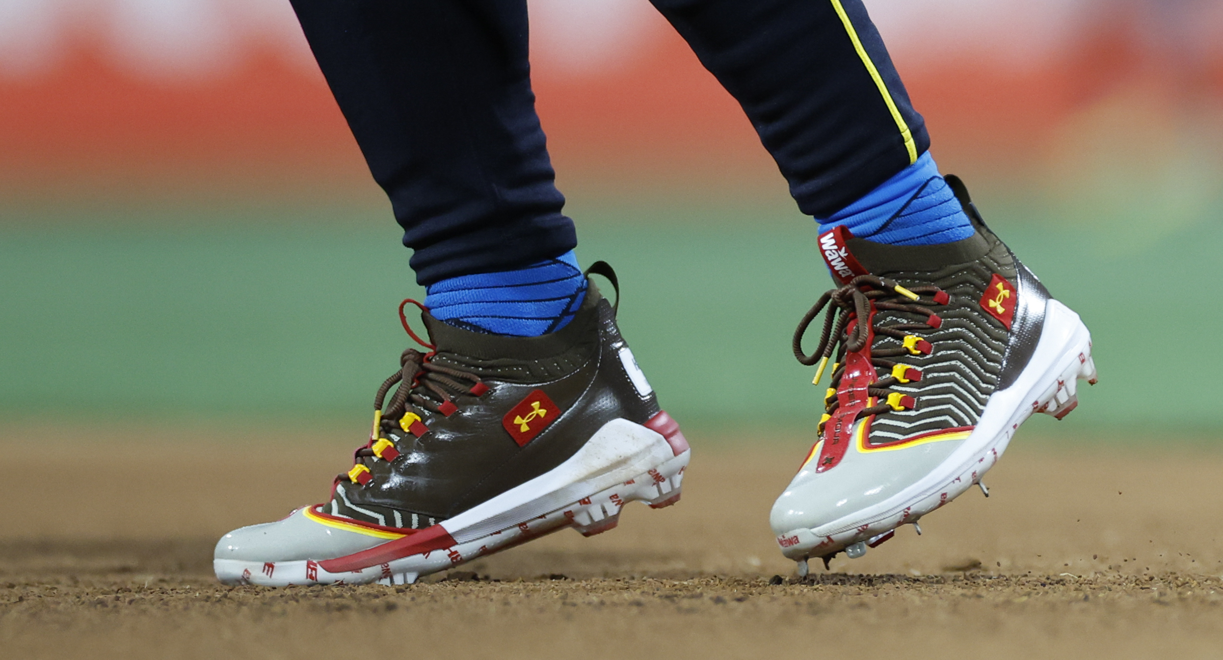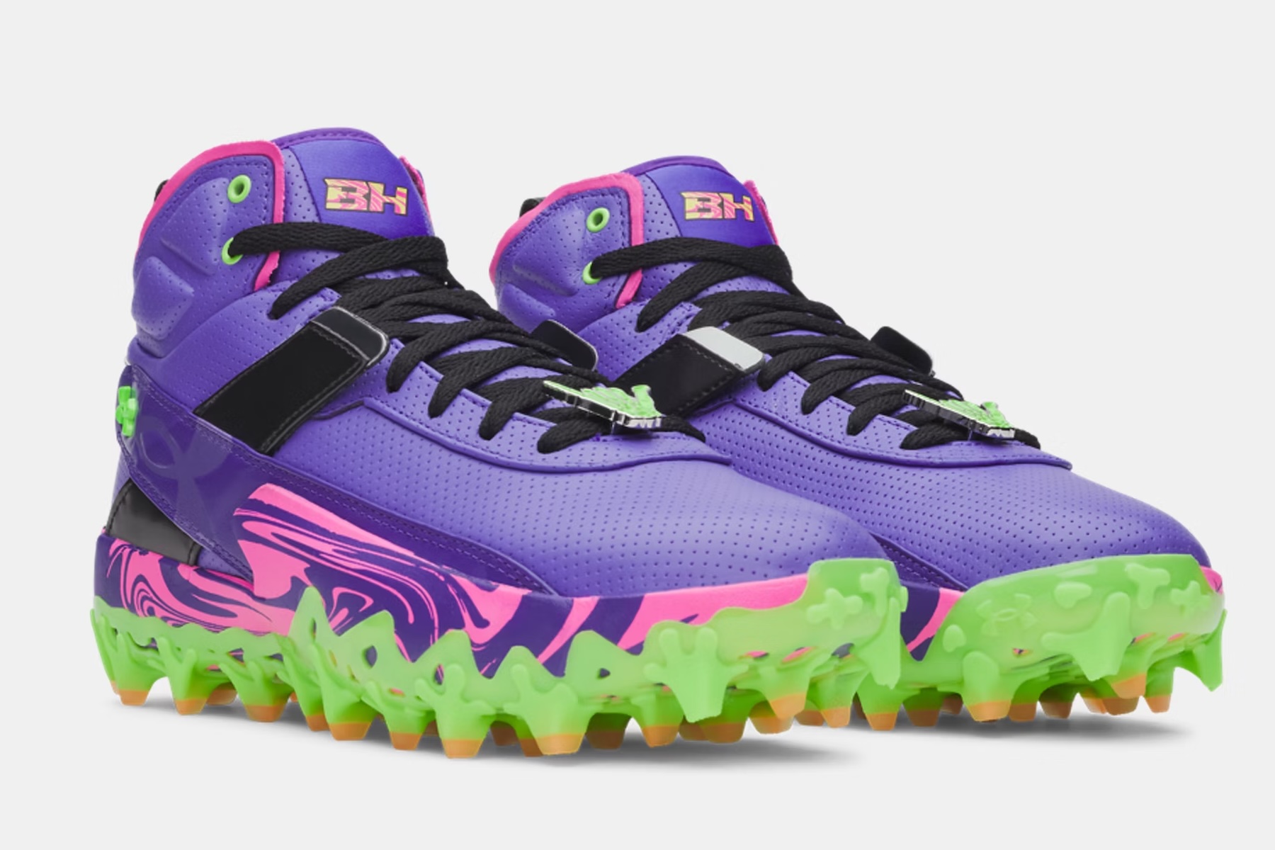 With a hyper violet base and slime-green studs that resemble a boardwalk funhouse, the cleats are “inspired by Bryce’s love for spending time at the Jersey Shore during the offseason early on in his career,” Under Armour said.