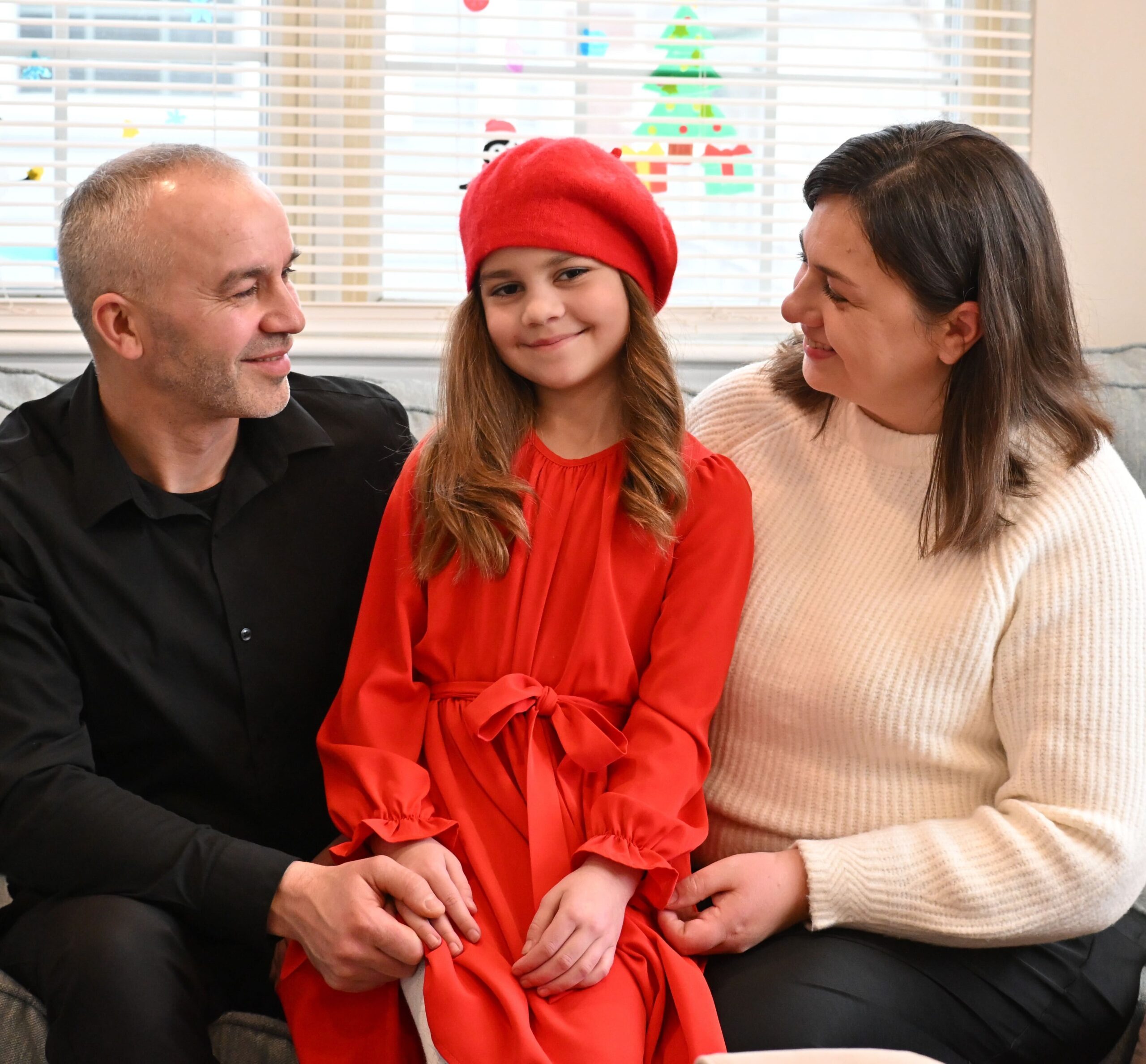 Milana Konoshchuk smiles for a portrait between her parents, Yurii (left) and Anna on Sunday, Feb. 15, 2026. Refugees from Ukraine, the Konoshchuks are living in Delaware County while their daughter receives medical treatment for leukemia at CHOP.