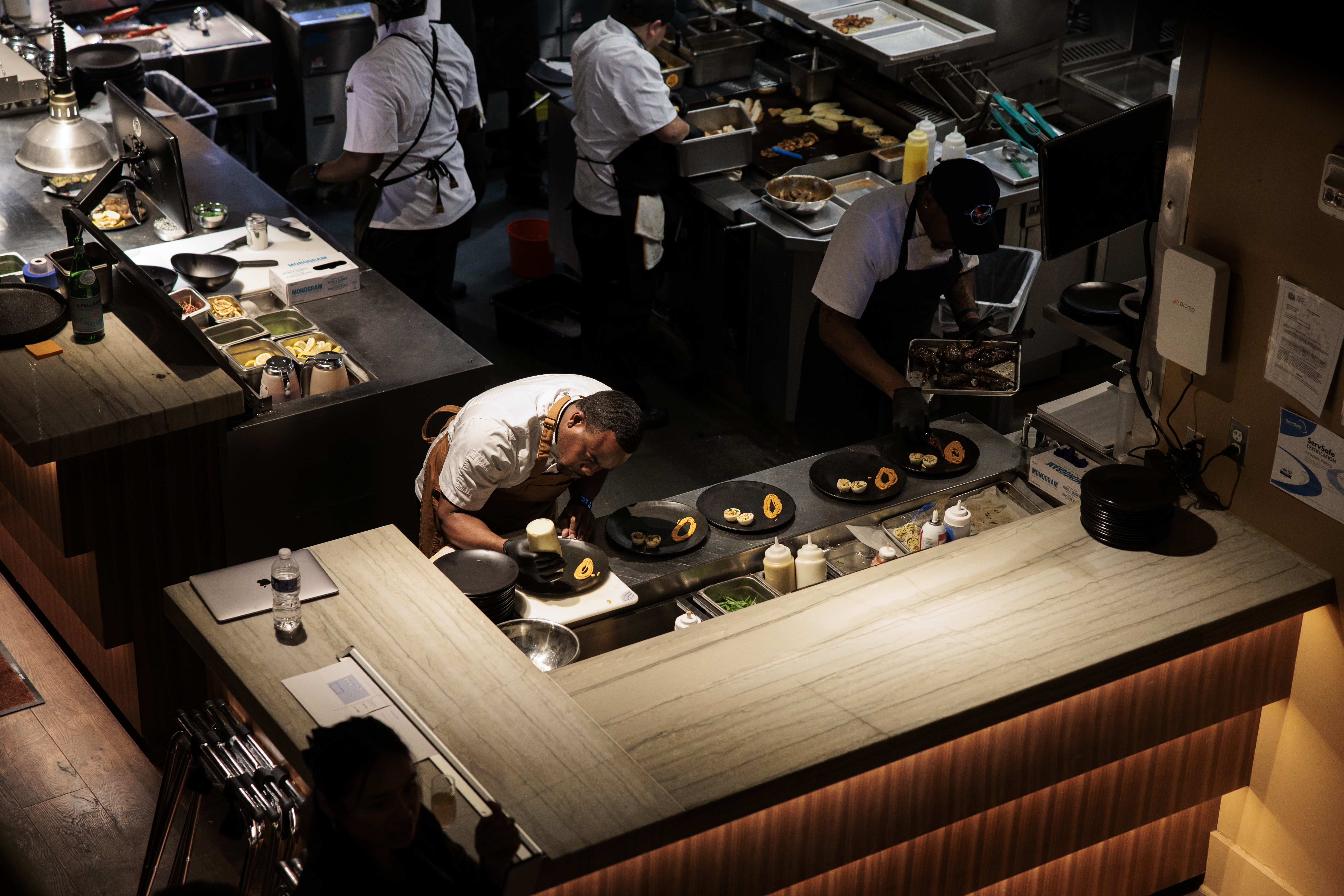 Cooks work in the open kitchen at Kitchen & Kocktails, as viewed from the mezzanine.
