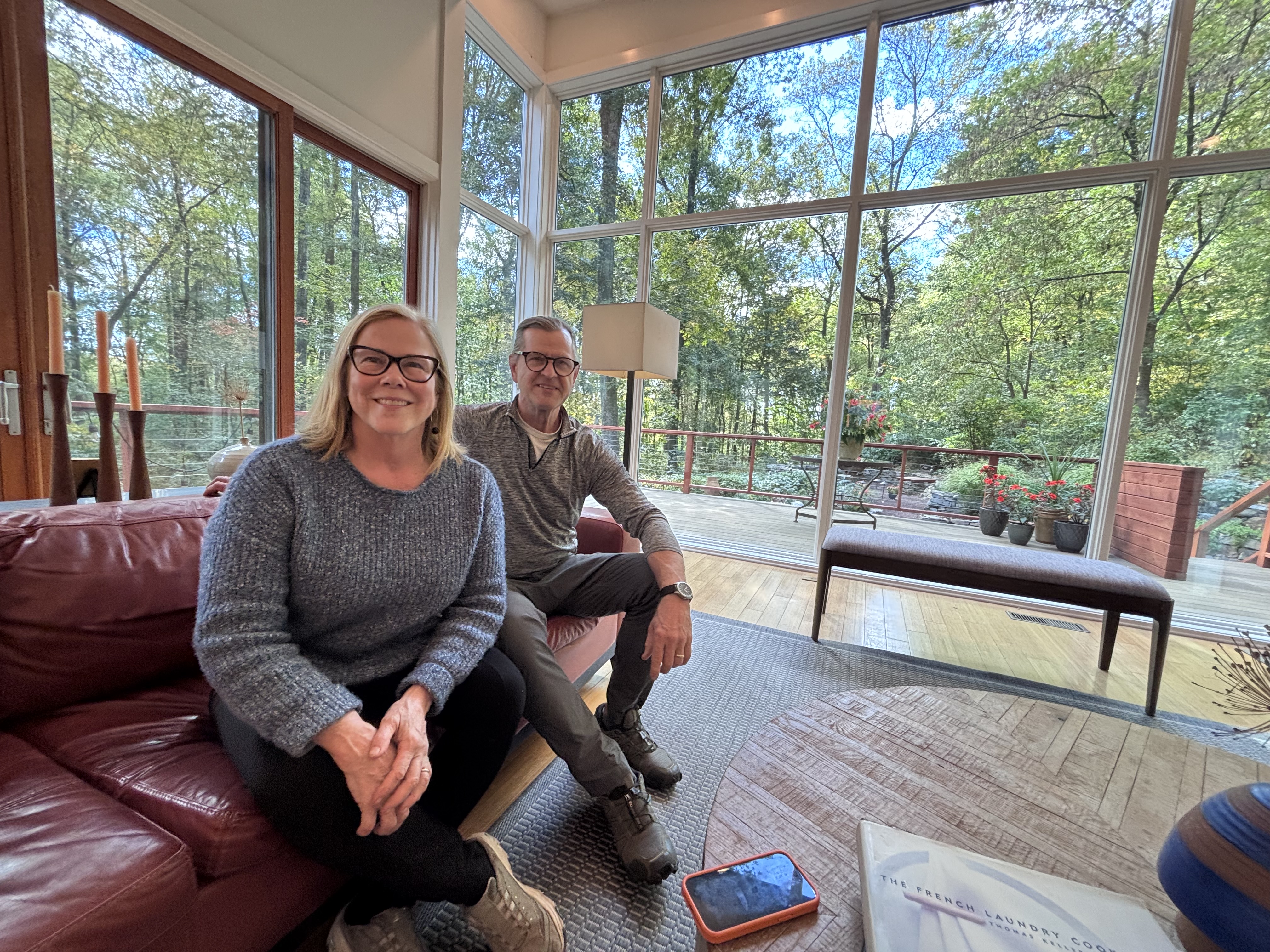 Pamela and David Anderson sit on their couch in their home, Copper House, where they host events and retreats.