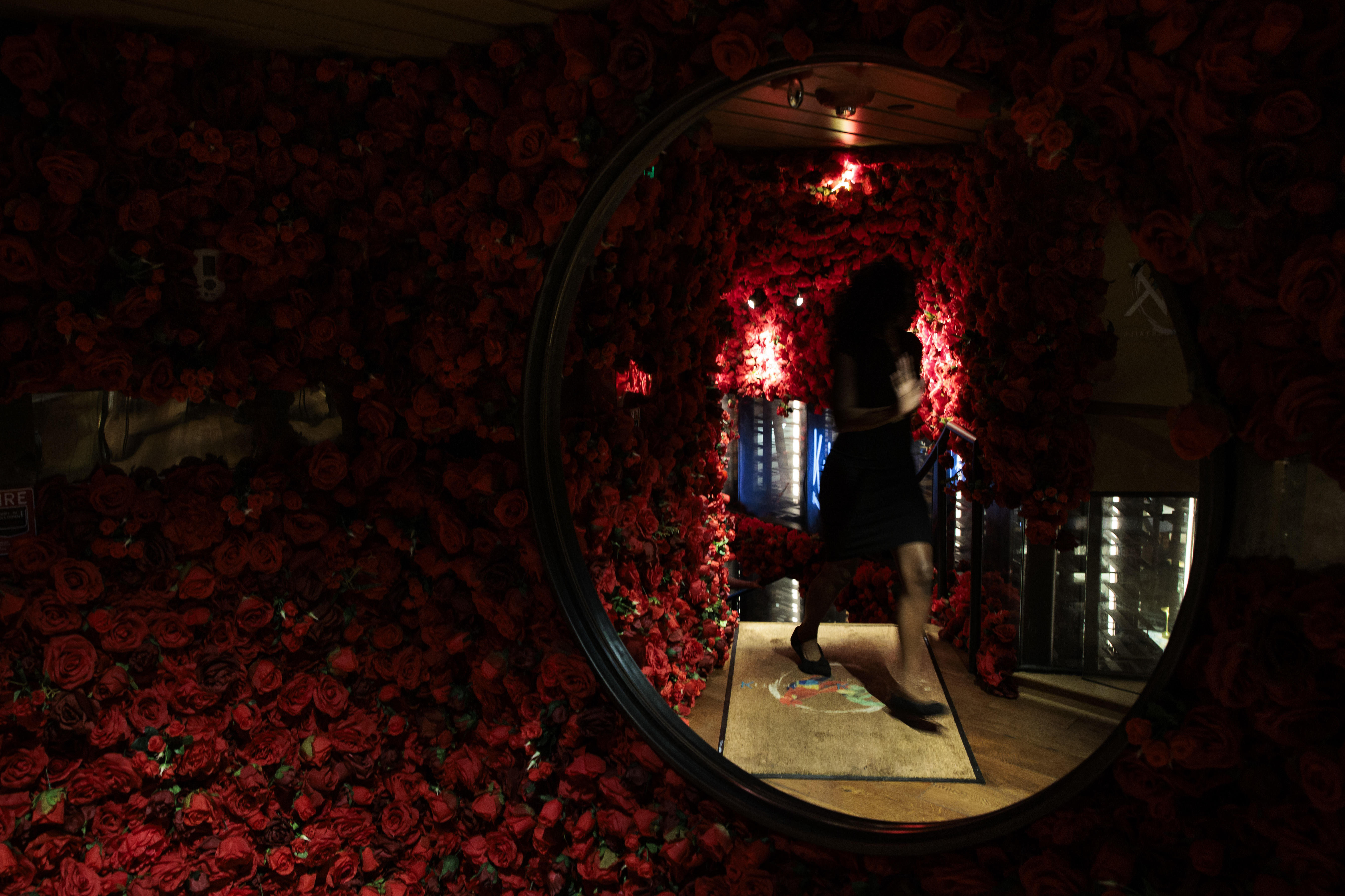 Roses cover the walls in the stairwell at Kitchen & Kocktails.