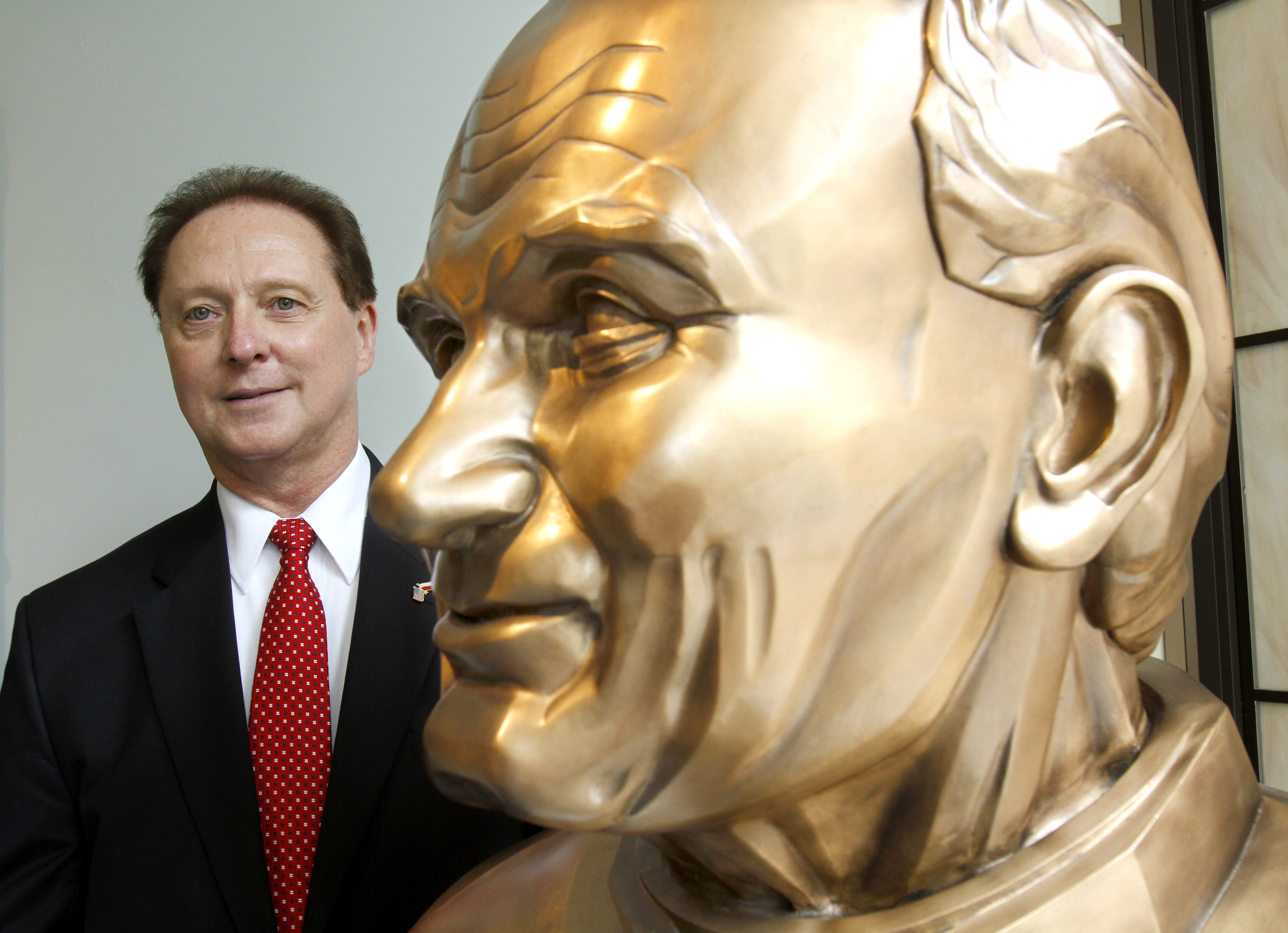 Michael Blichasz, president of the Polish American Cultural Center, stands beside a bust of the former Pope John Paul II.