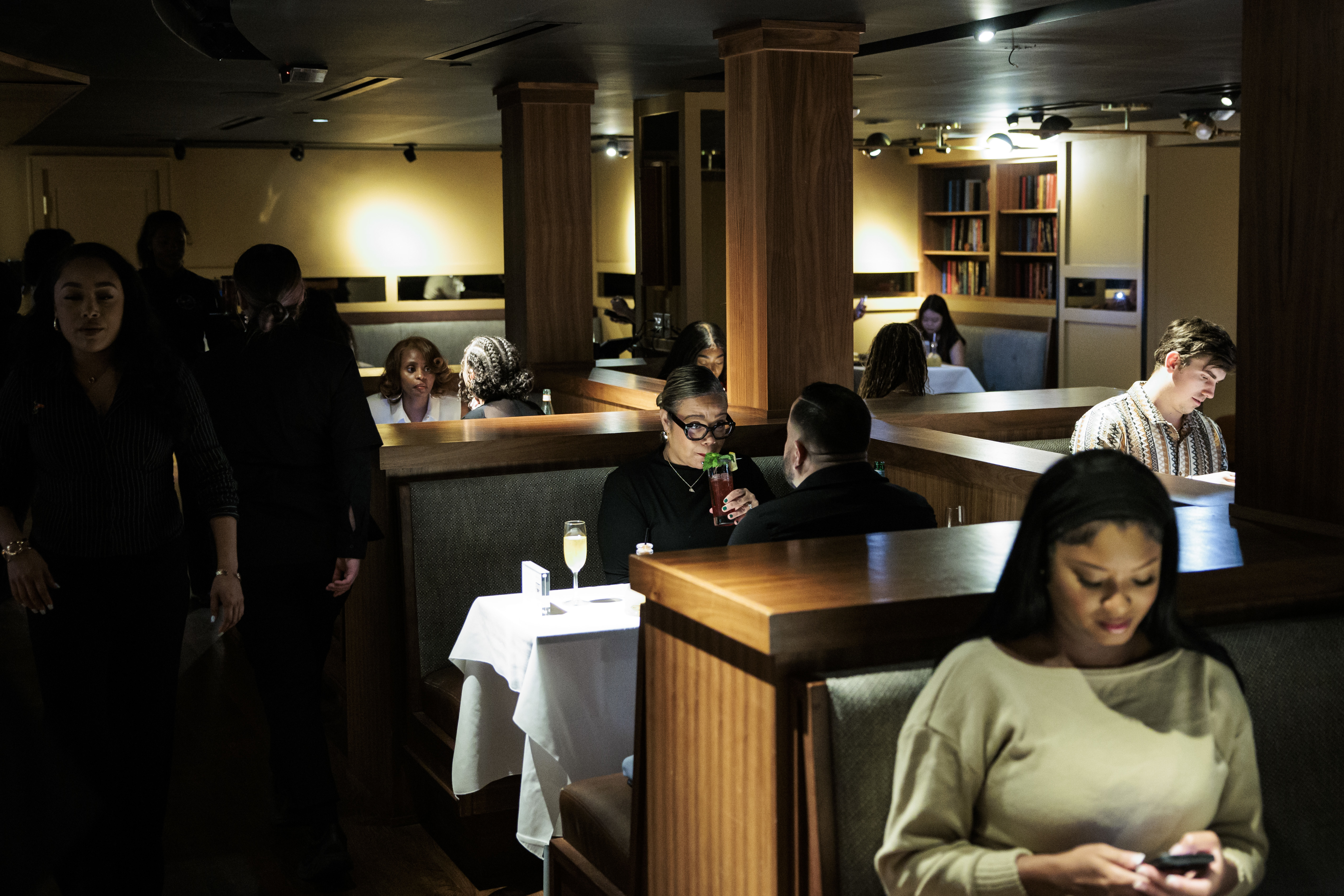 Customers step into the sleek, high-ceilinged reception area, decorated with greenery, next to a wine tower. Staff greets everyone with a “welcome home,” Kelley said. The jade blue onyx marble bar is front and center next to an open kitchen. At a preview party recently, influencers deftly balanced their cell cameras and LED lights while climbing the stairs to the mezzanine through a gauntlet of red roses. Kelley also hosted nonprofit groups, including Mothers in Charge, which supports families who have lost children to gun violence.