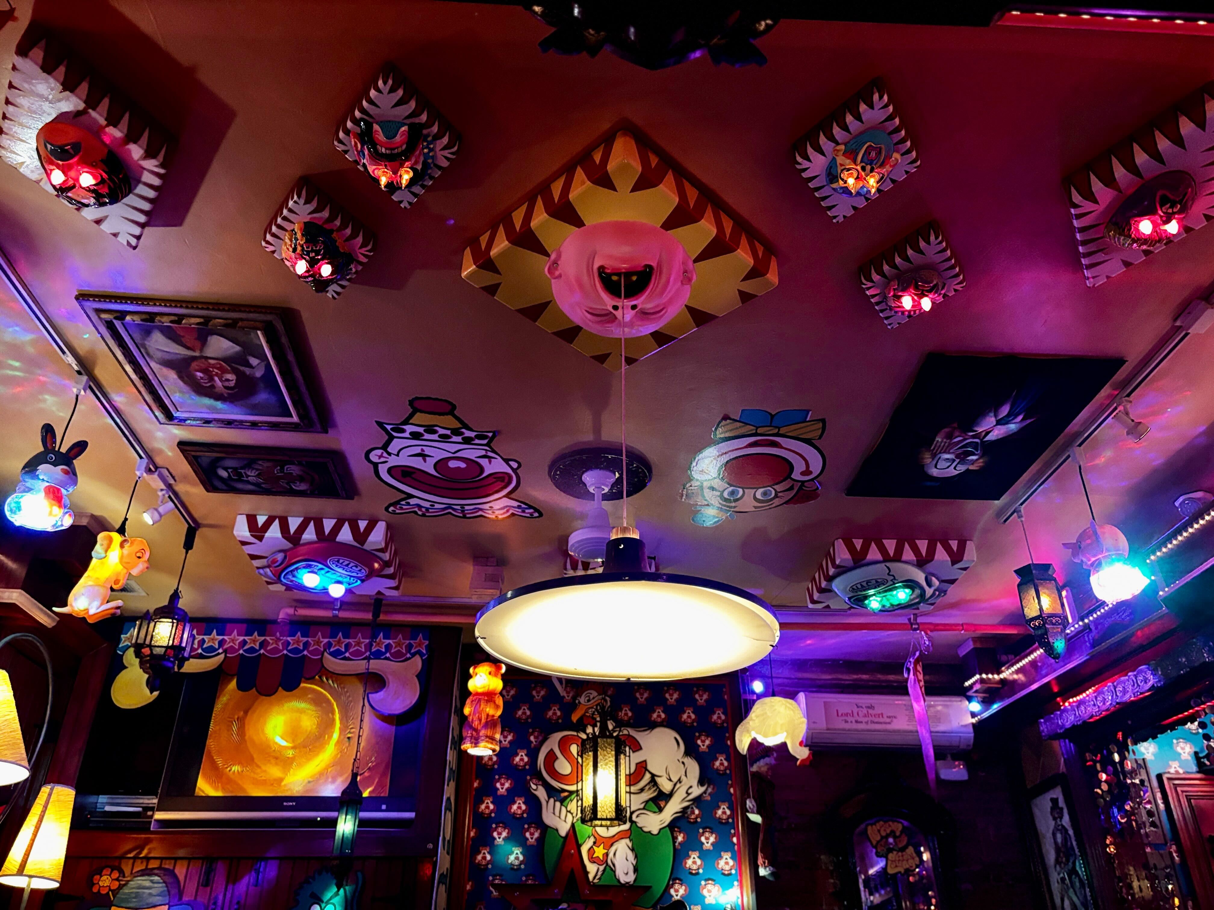 The ceiling of Kensington’s Neon Clown Dream Lounge is covered with clown masks that owner Chicken retrofitted into lighting fixtures.