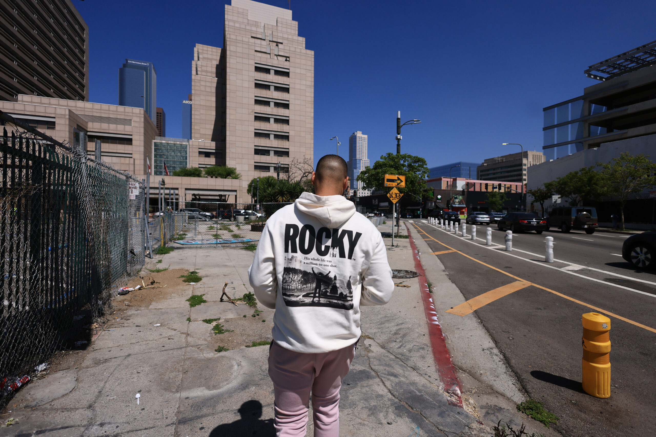 On a recent morning, a man in a red plaid shirt stretched out on a ledge near a palm bush and slept. A few feet away, another man, dressed in ratty black, crouched down, put his hands on the sides of his head, and began screaming. A pair of white sneakers dangled from a wire stretched above, giving the lot a Philadelphian flavor. Around the corner, a dog had dropped something in the middle of the sidewalk that its owner, if the animal even had an owner, hadn’t bothered to scoop up.
