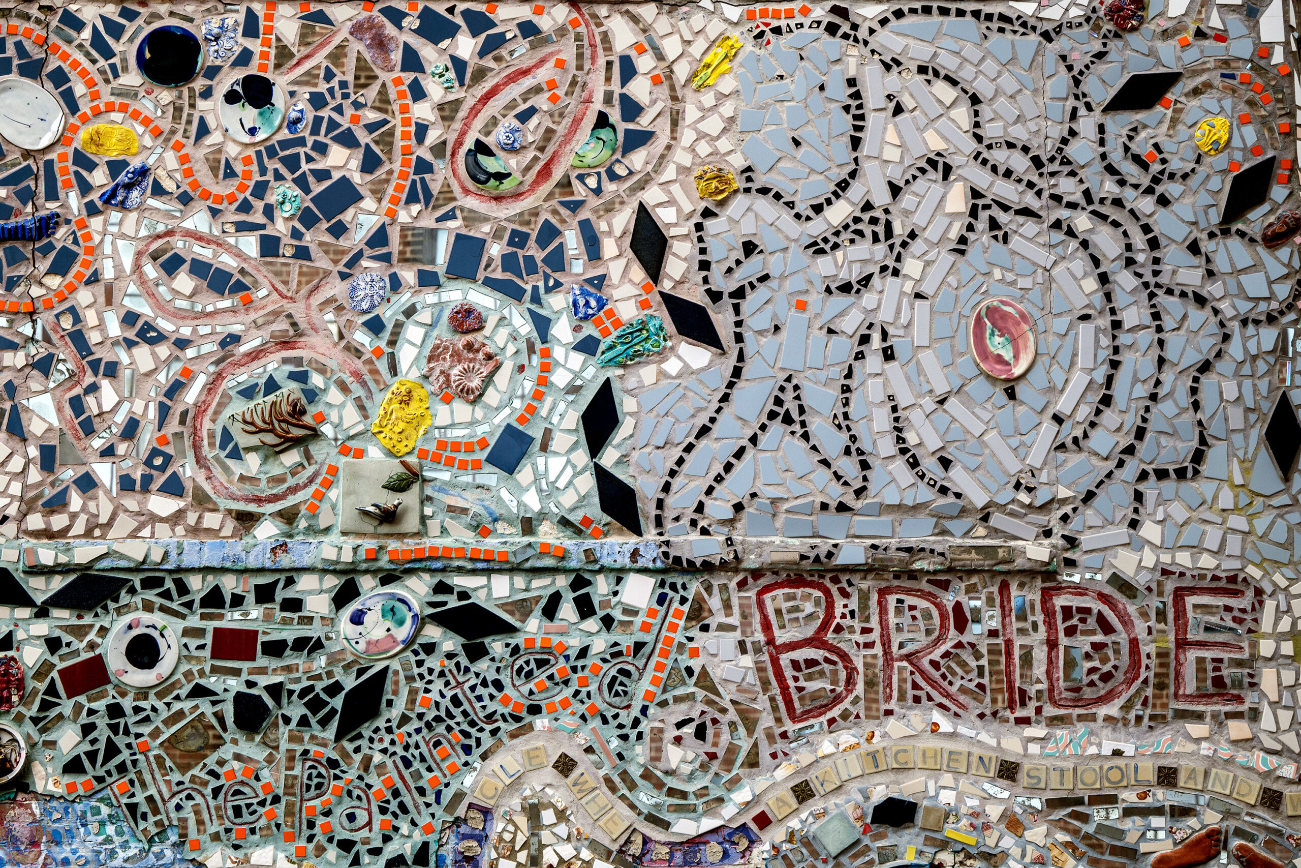 His process included embedding everything from broken teapots and cups to plates and crystal into the cement while it was still wet. Mirrors, however, were an early favorite of Mr. Zagar’s.