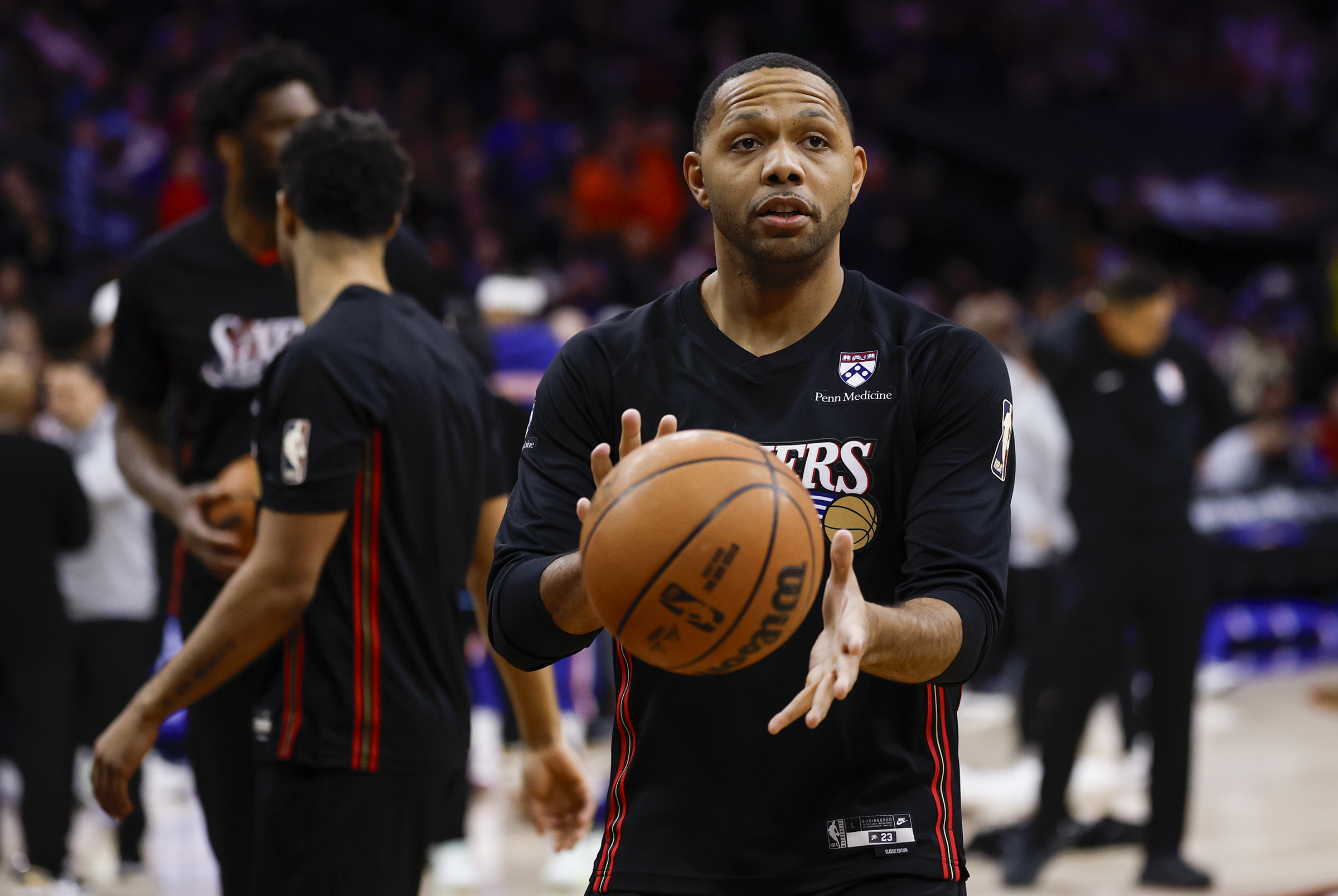 Sixers guard Eric Gordon during warm ups before the Sixers played the New York Knicks on Saturday, January 24, 2026 in Philadelphia.