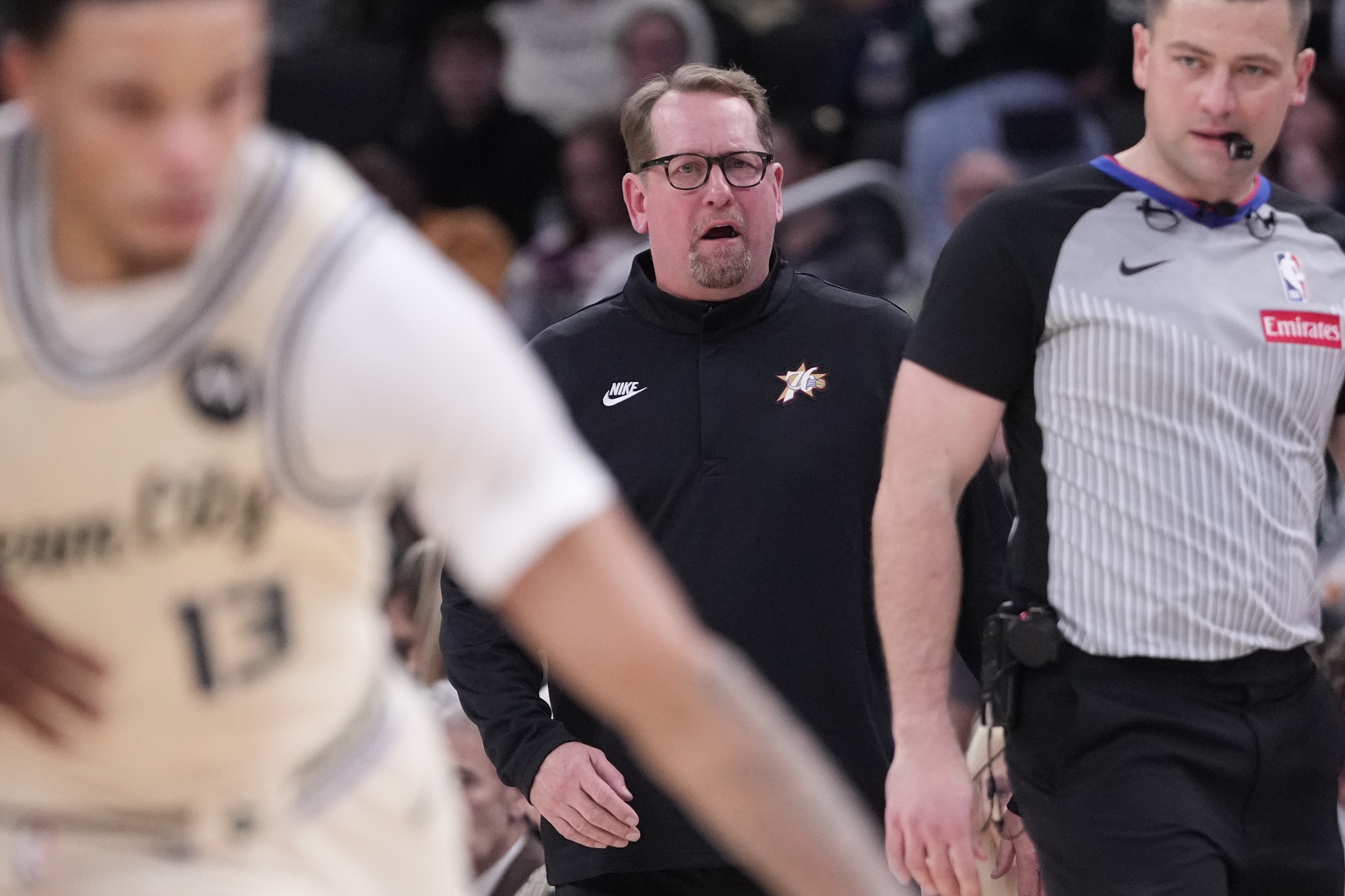 Sixers head coach Nick Nurse watches his team during the first half of their win against the Bucks.