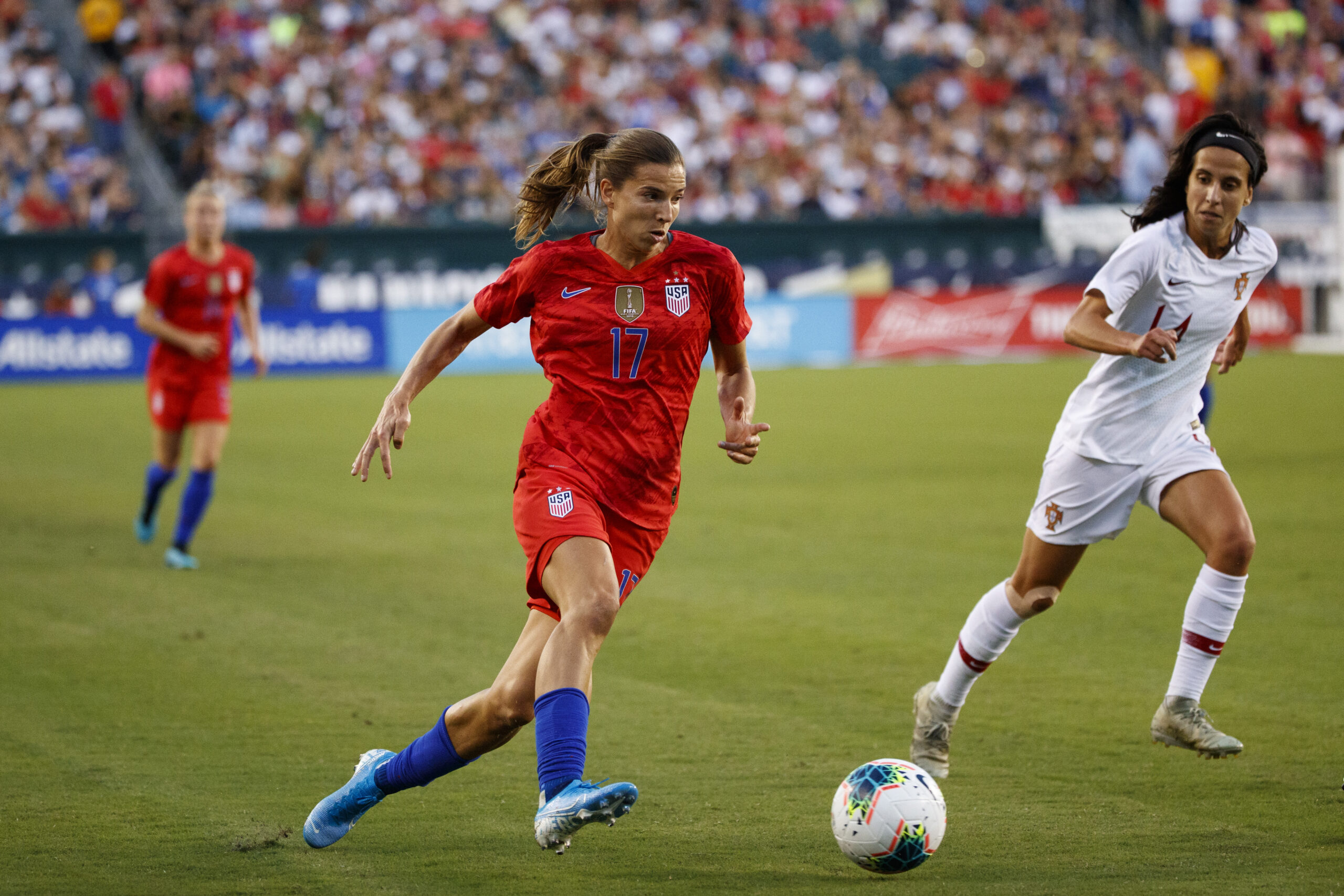 Tobin Heath playing in Philadelphia in 2019. She won two World Cups, two Olympic gold medals, and two NWSL championships in her career.