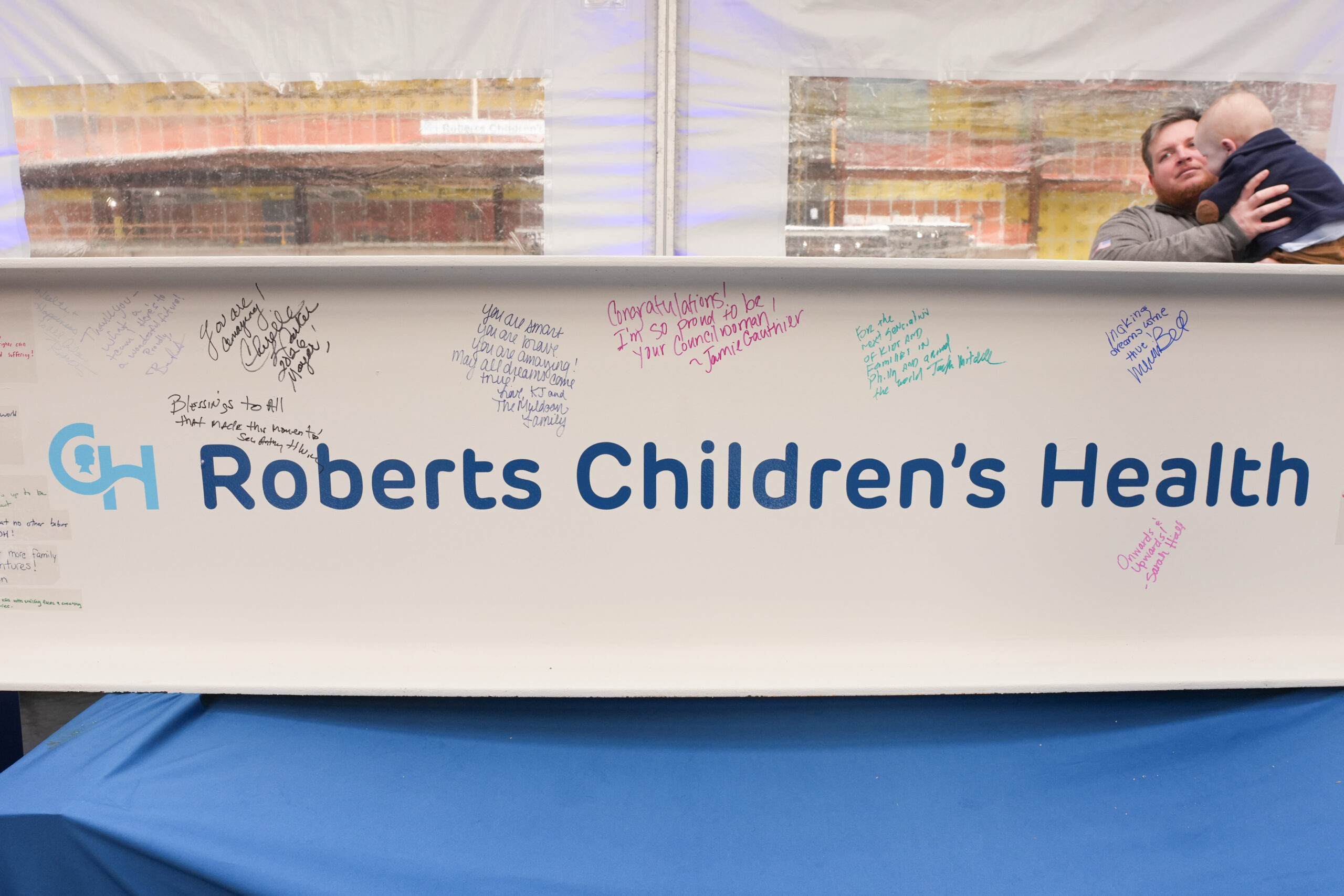 Roberts read aloud messages from patients at CHOP that were signed onto the beam.