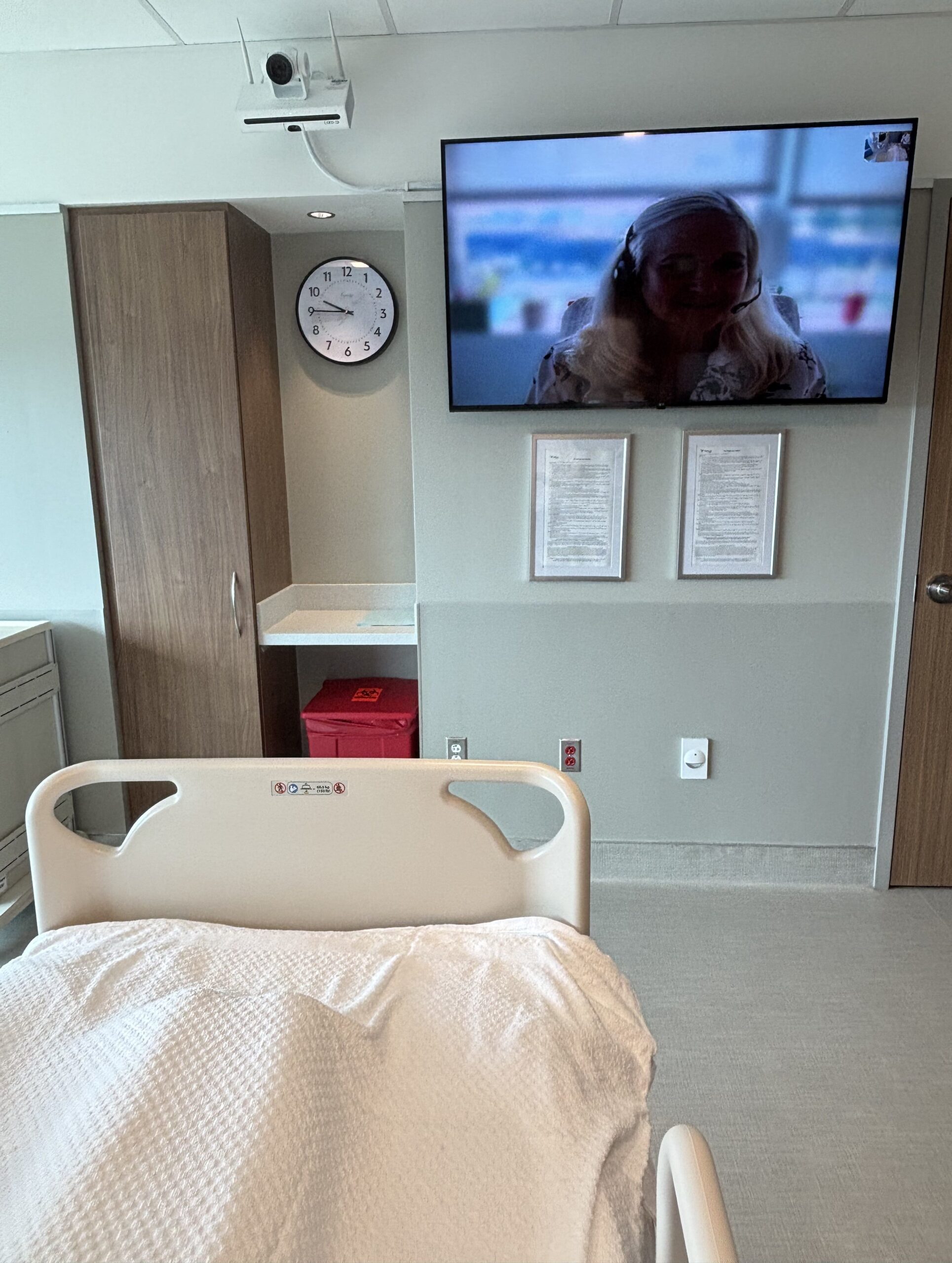 Virtual nurses at Virtua Health appear on the television in a patient’s room.