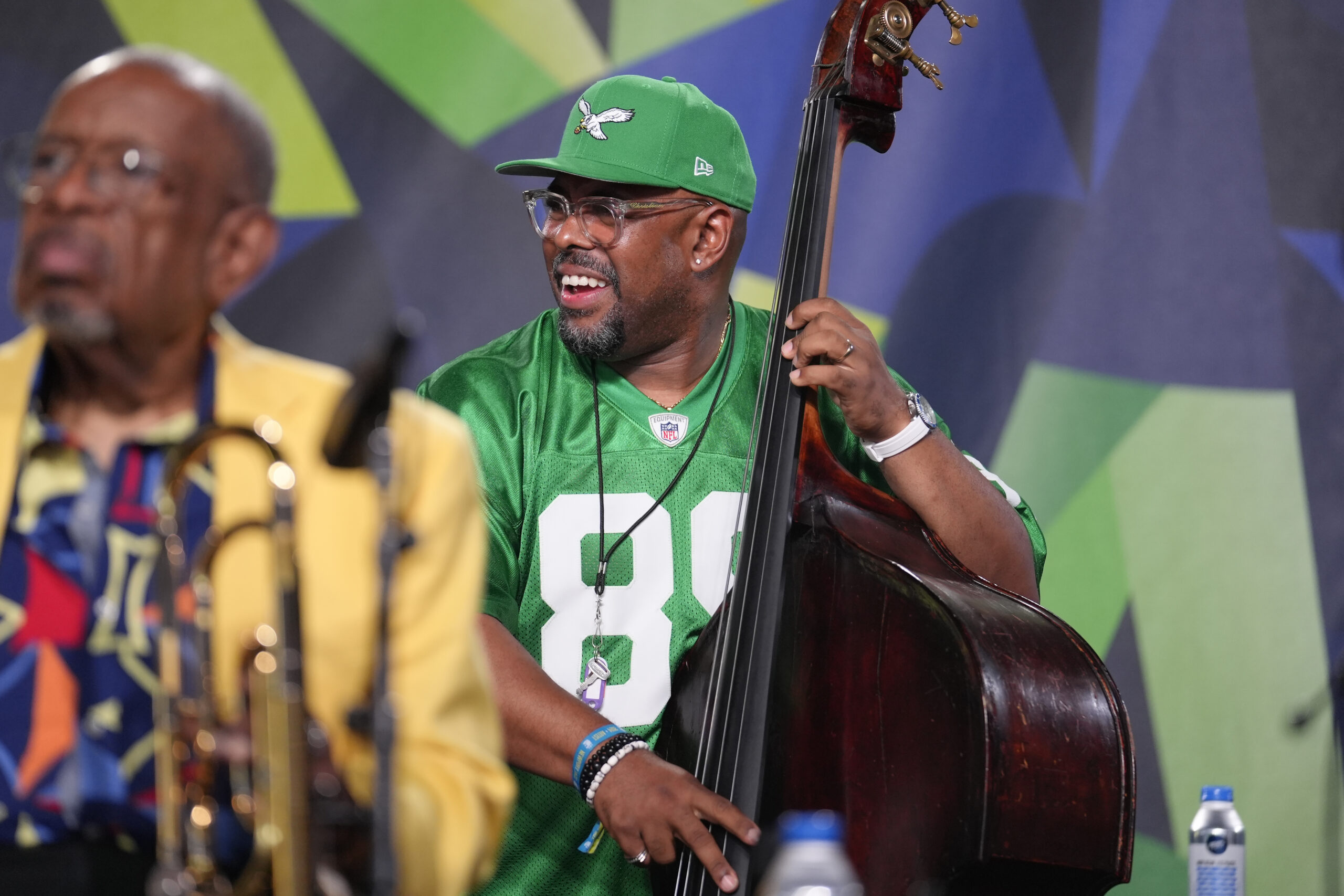 Bassist Christian McBride (right) performs during the Newport Jazz Festival, Sunday, Aug. 4, 2024, in Newport, R.I. The Philadelphia musician is up for three Grammys on Sunday.(AP Photo/Steven Senne)