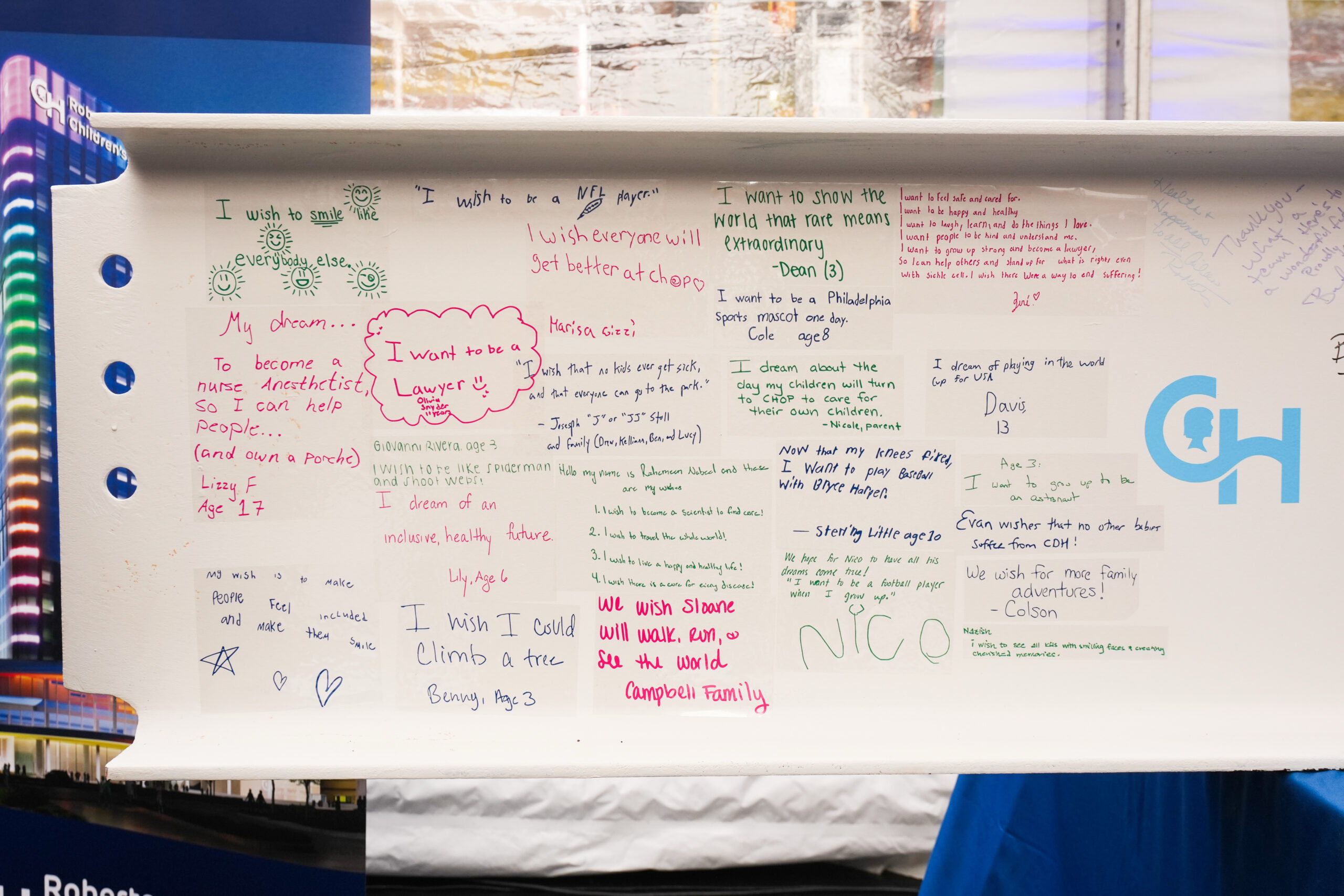 On the beam were colorful messages from patients at CHOP who were asked to write down their dreams.