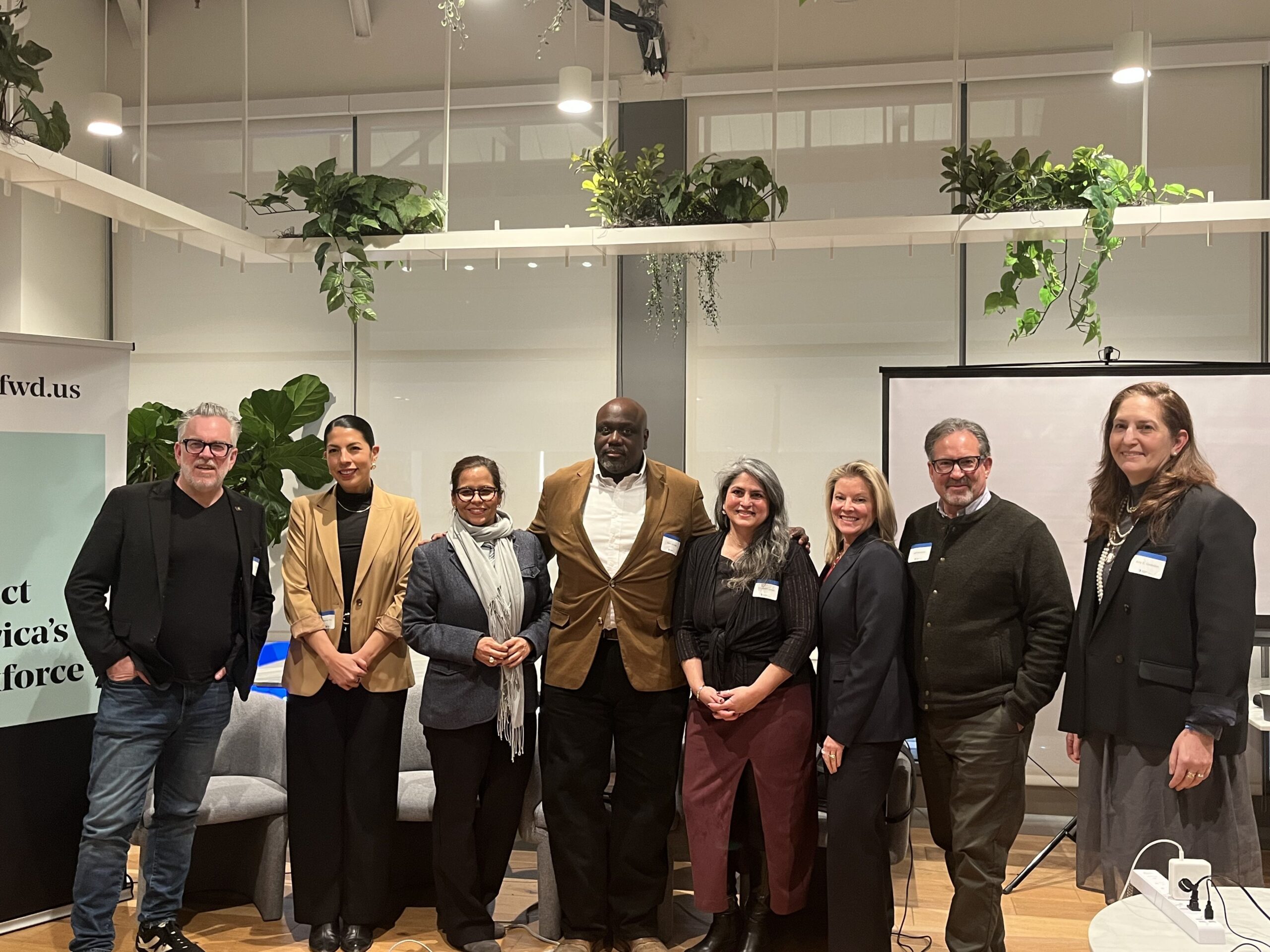 The Economy League of Greater Philadelphia held a panel discussion in collaboration with FWD.us. From left are Ben Fileccia, Pennsylvania Restaurant & Lodging Association; Maria Praeli, FWD.us; Jennifer Rodriguez, Greater Philadelphia Hispanic Chamber of Commerce; Alain Joinville, Philadelphia’s Office of Immigrant Affairs; Elizabeth Jones, the Welcoming Center; Tracy Brala, University City Science Center; Jeff Hornstein, the Economy League of Greater Philadelphia; Amy Gadsden, University of Pennsylvania.