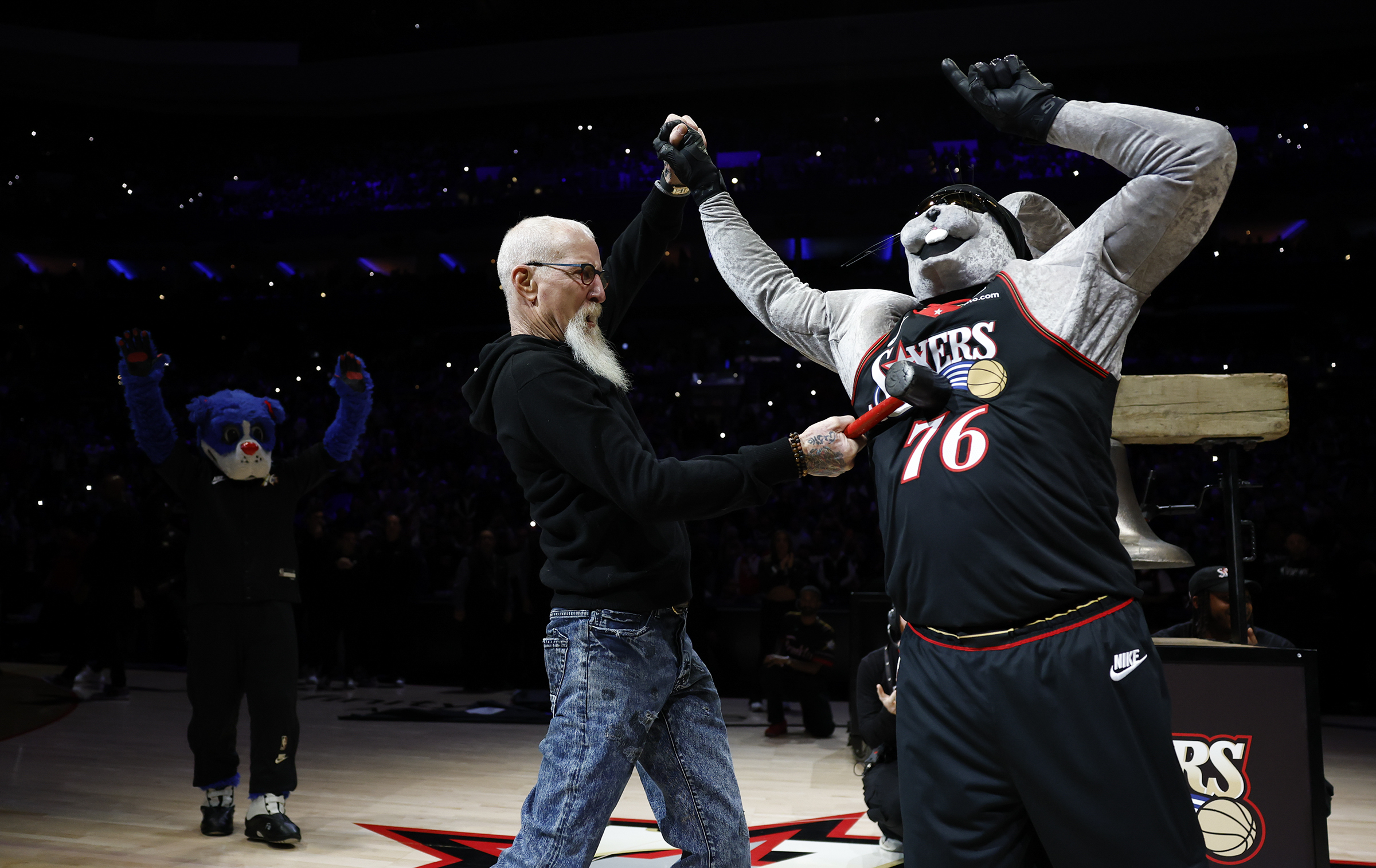 Former Sixers President Pat Croce jokes with past team mascot Hip-Hop during pregame ceremonies before the Sixers-Pelicans game on Saturday.