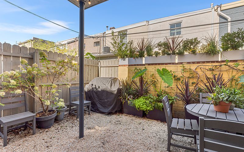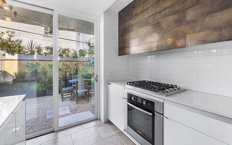 The kitchen has quartz countertops, stone flooring, stainless steel appliances, a Wolf range, and a magnetic blackened steel wall. There is a private garden patio.