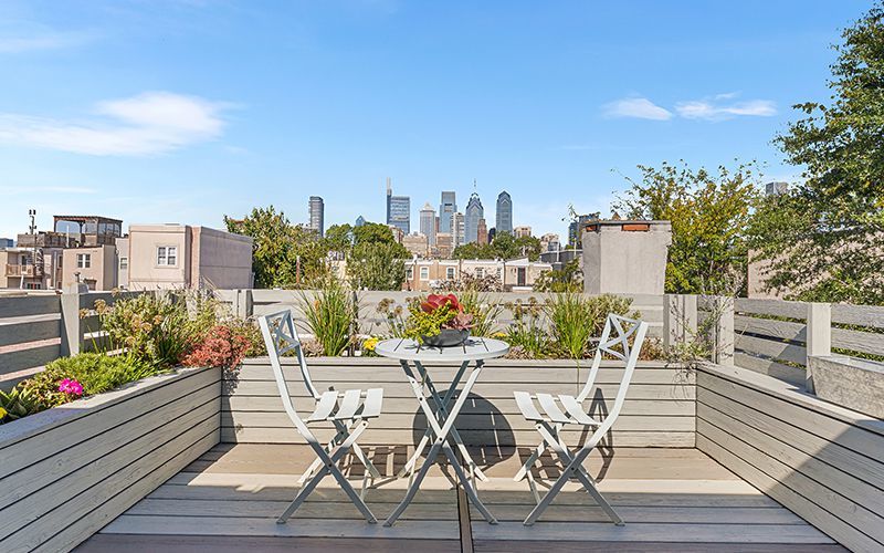 The roof deck has unobstructed skyline views.